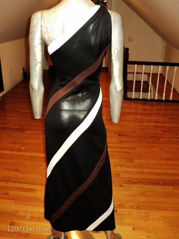 Beautiful maxi dress by then famous Ayres Unlimited . From the early 1970's A line look elongated stripes of brown and white on a black background . I believe it is a poly knit jersey..