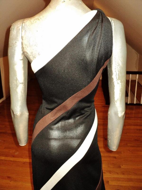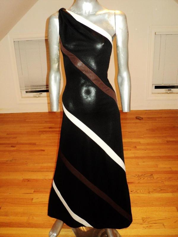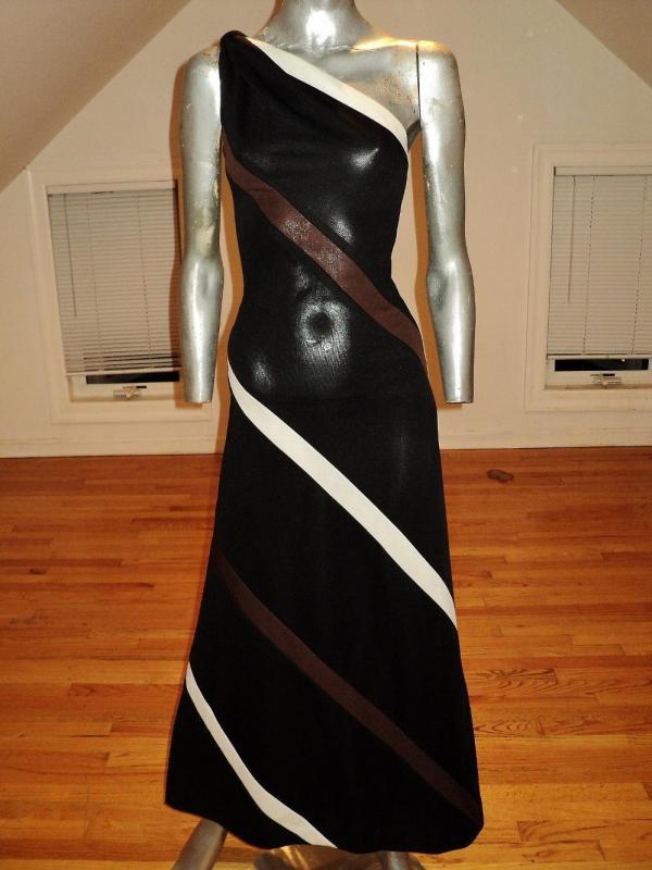 Beautiful maxi dress by then famous Ayres Unlimited . From the early 1970's A line look elongated stripes of brown and white on a black background . I believe it is a poly knit jersey..