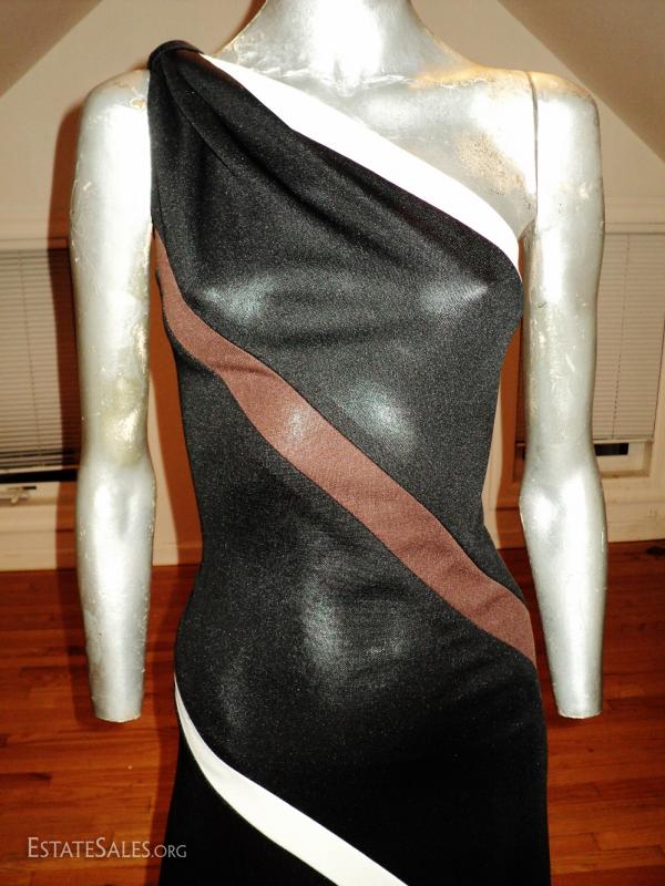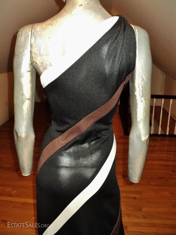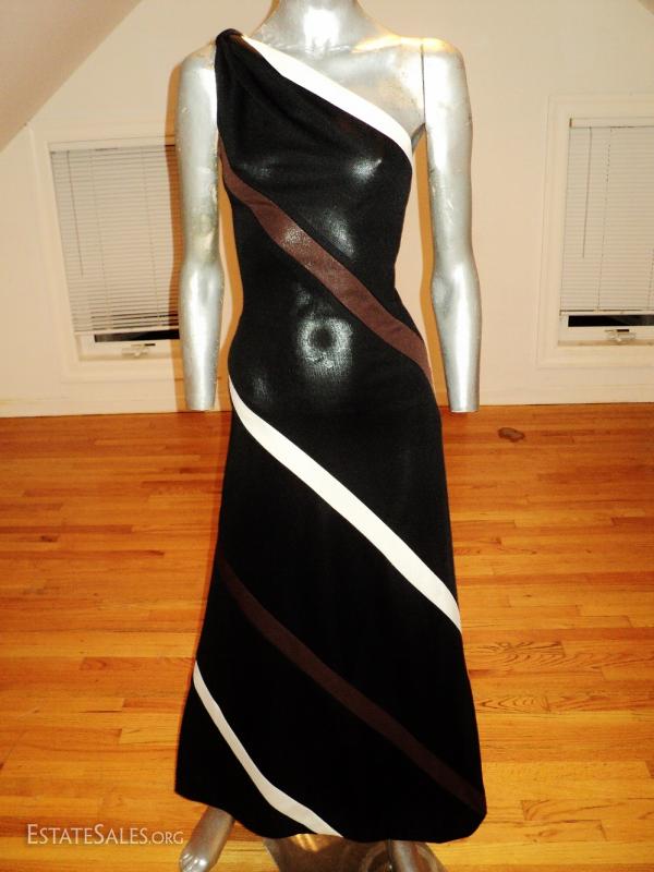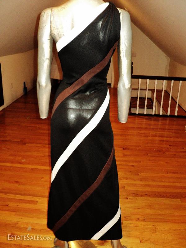 Beautiful maxi dress by then famous Ayres Unlimited . From the early 1970's A line look elongated stripes of brown and white on a black background . I believe it is a poly knit jersey..