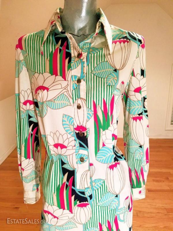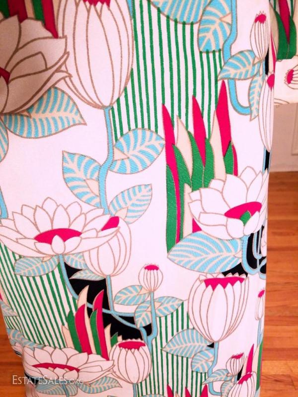 An original and rare beauty by famous Wilroy Traveller New York Circa 1960's hand painted lotus flowers with gold paints Acetate Poly fluid knit. In very good vintage condition .Vtg size 14