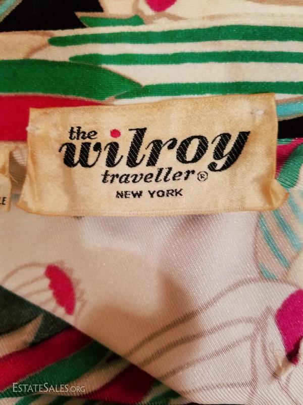An original and rare beauty by famous Wilroy Traveller New York Circa 1960's hand painted lotus flowers with gold paints Acetate Poly fluid knit. In very good vintage condition .Vtg size 14