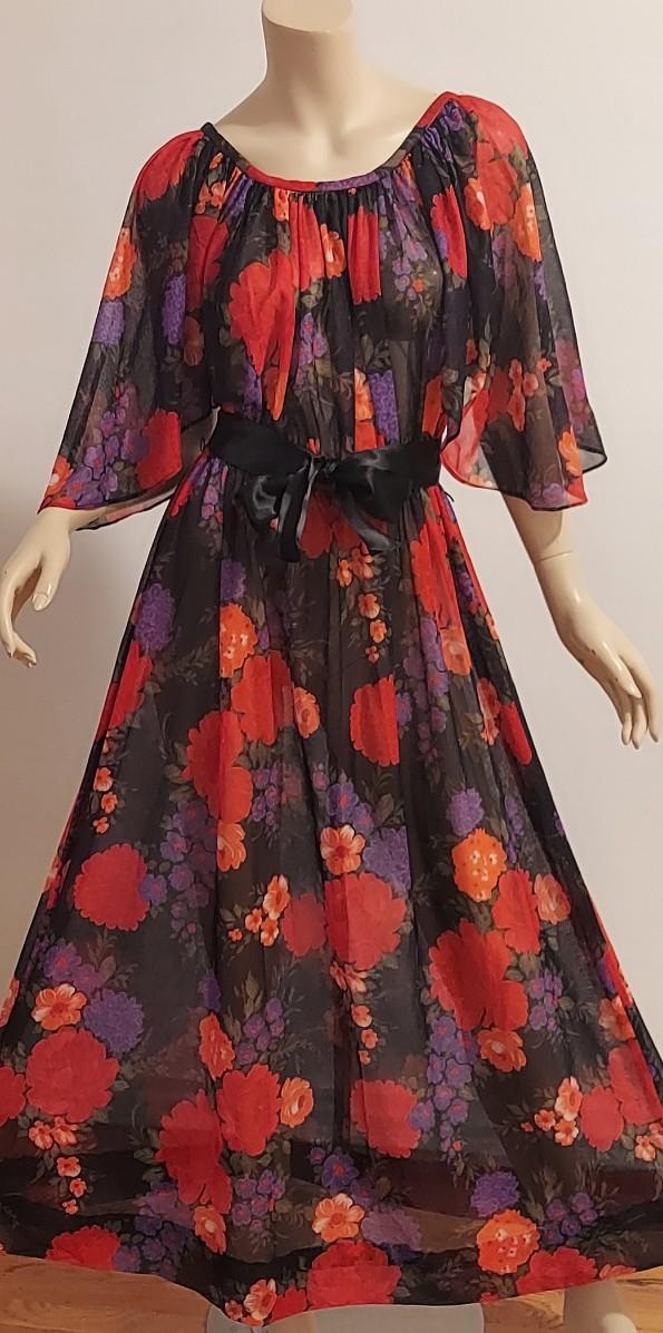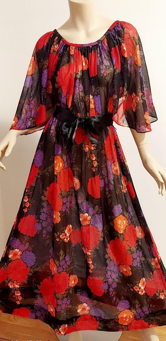 Vtg 60-70s Solo San Francisco Semi Sheer. Country Maxi floralndress Sash Belt. Bat Sleeves