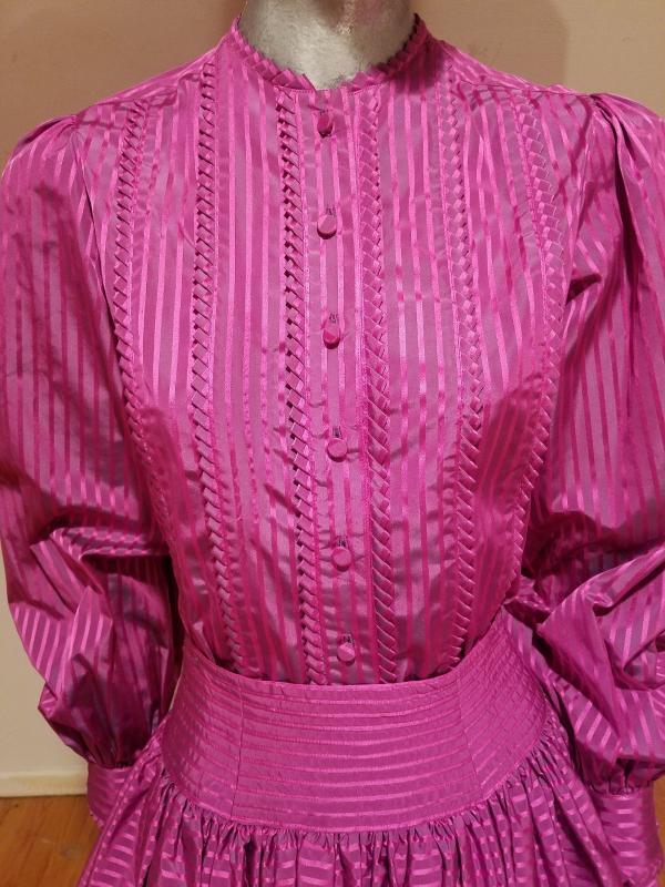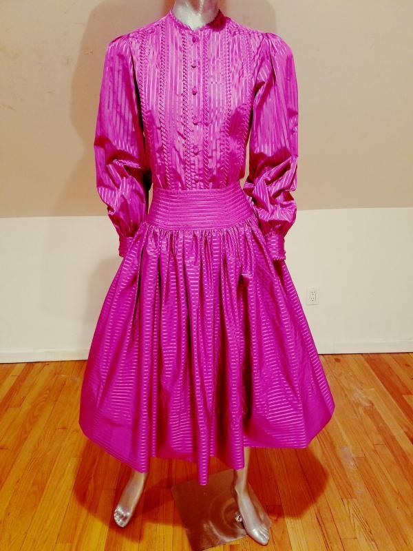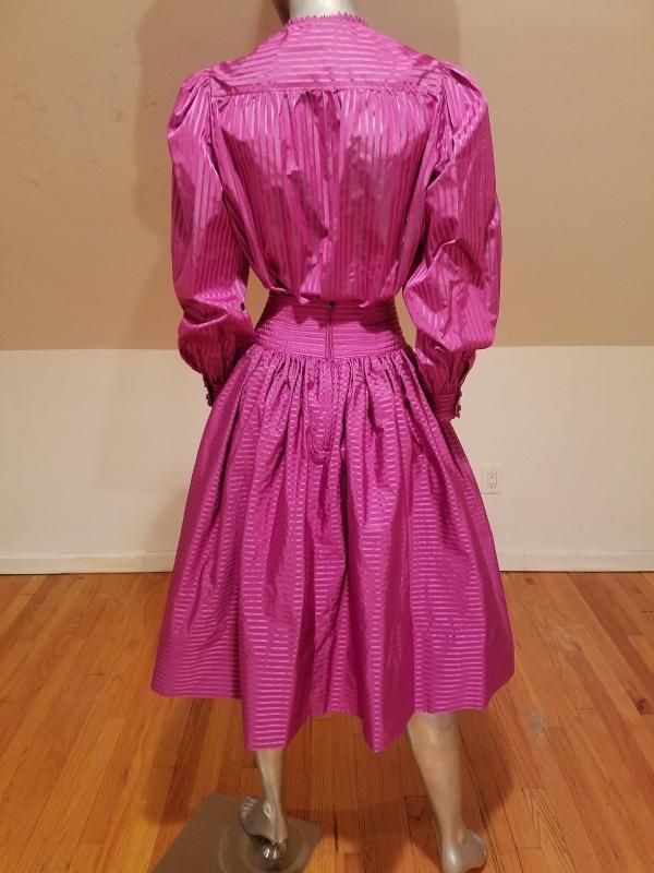 Amazing 2 piece tiered skirt and ruffled blouse in a gorgeous Magenta coloration.Silk semi sheer striped across. Quilted embroidered skirt waist sash. covered buttons. Never worn and ready to wear. A stunner.