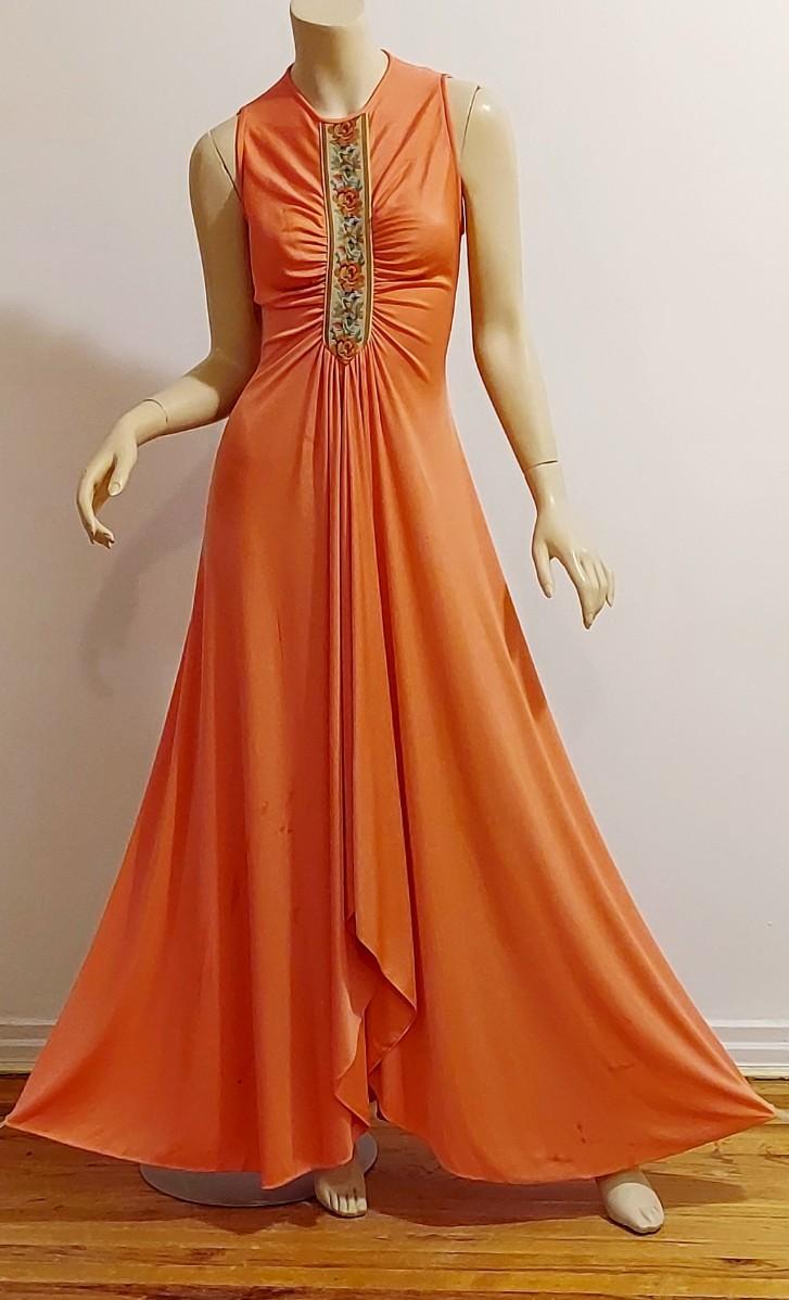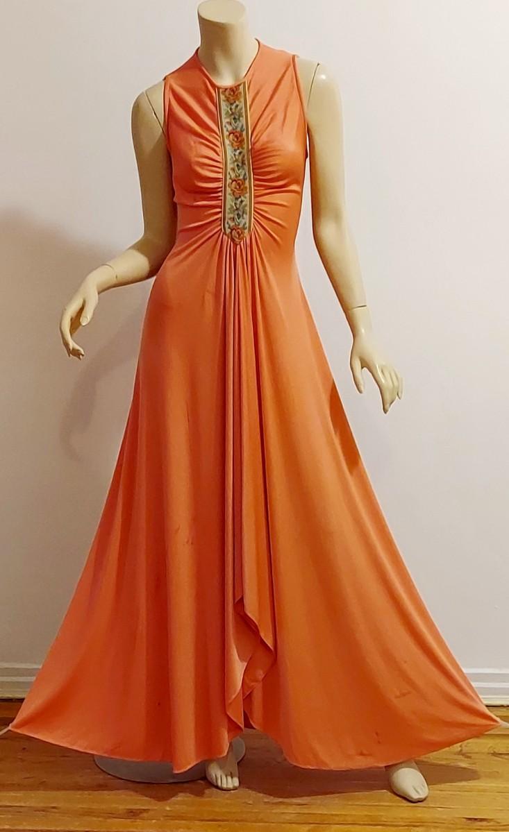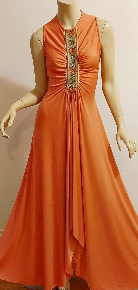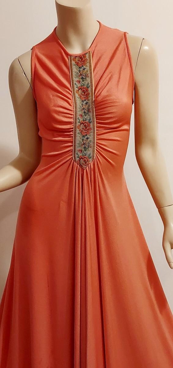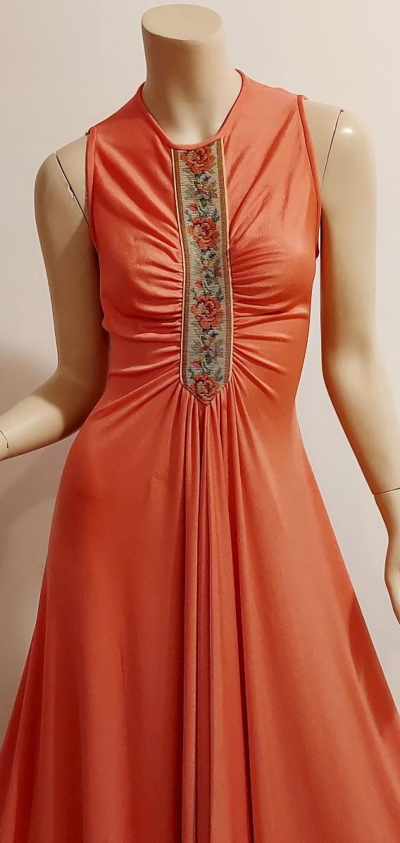 A Real Beauty Stretch Jersey Maxi Flared bottom dress with Shirred Bodice with Edwardian type embroidered Ribbons