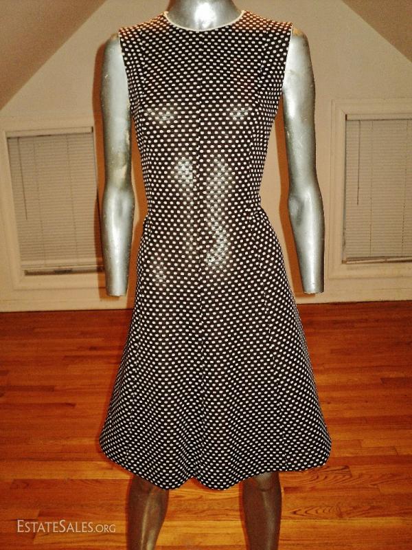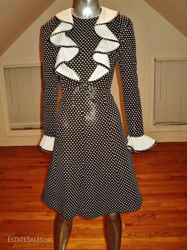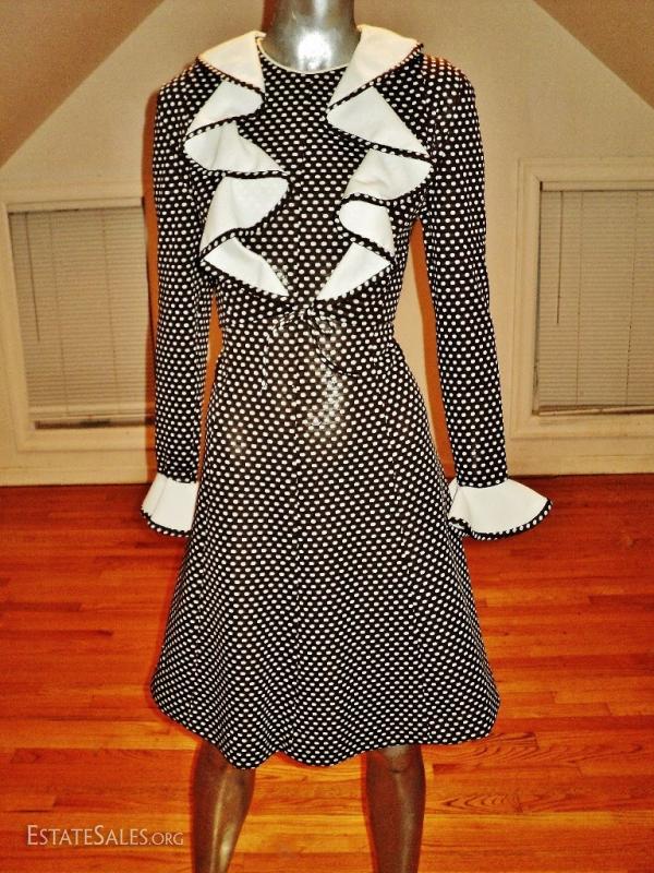 Stunning ensemble fitted to the Era.. A line dress with a tux like jacket adorned by white fuffles at neckline and sleeves. In great vintage condition. Size - M/L