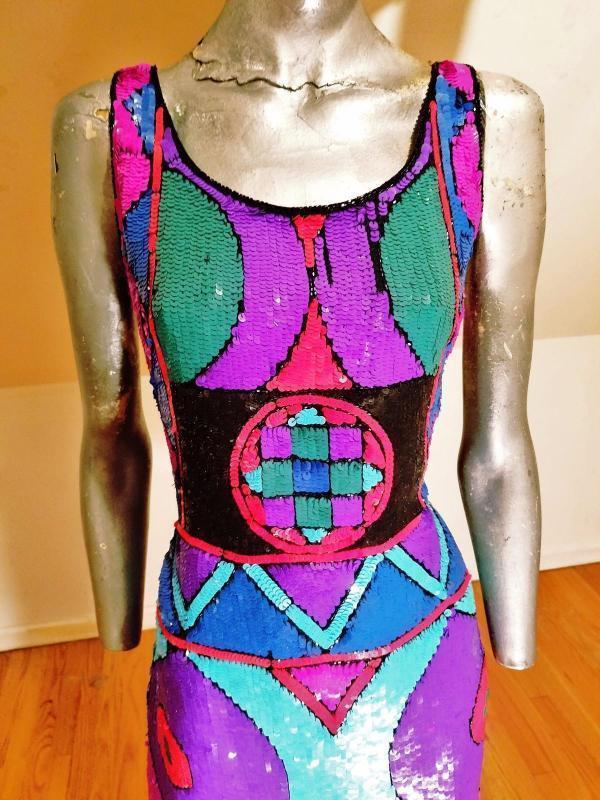 Vtg 1970's Geometric silk dress fully sequined embellished Amazing