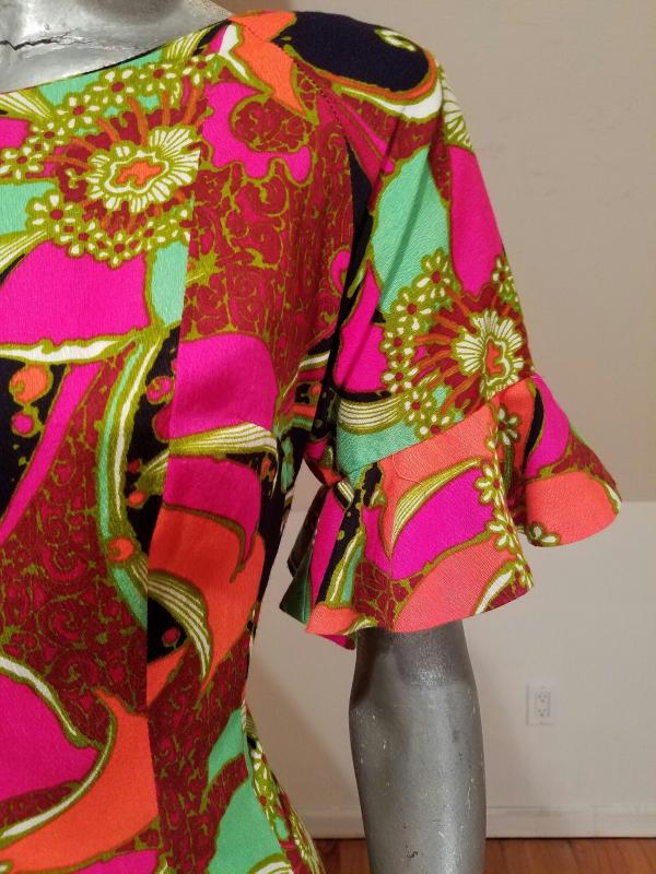 Fabulous vintage Hawaiian maxi Mod psychedelic floral print .Princess seaming, short sleeves with ruffled bottoms. A line with ruffle wide hemline . Back zipper.