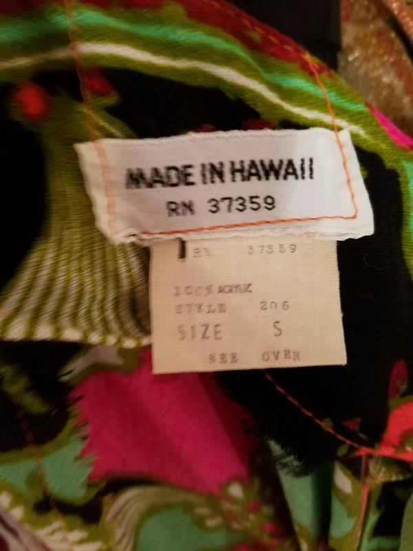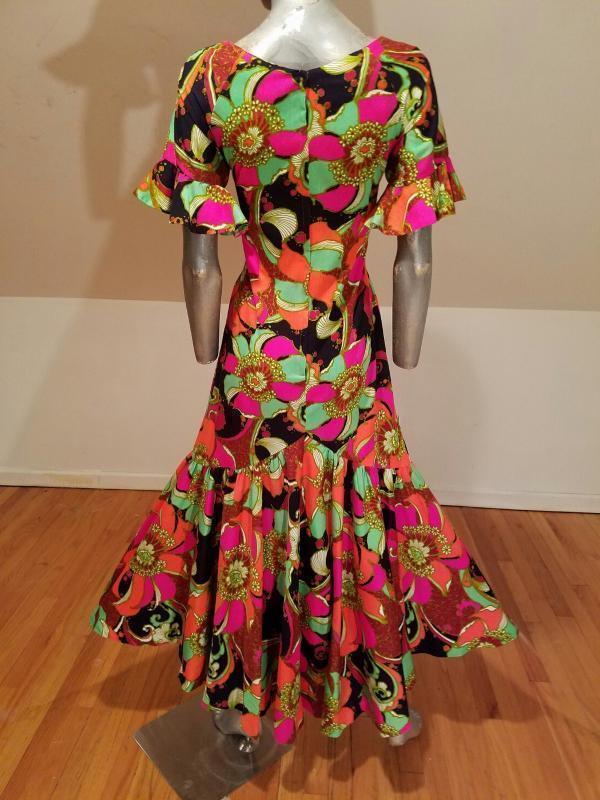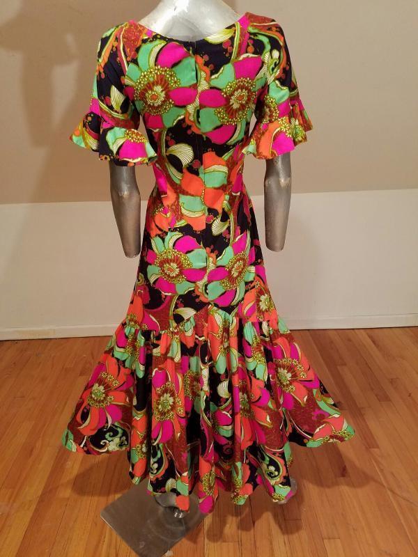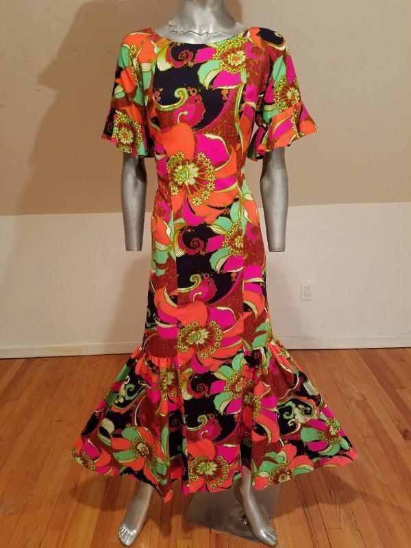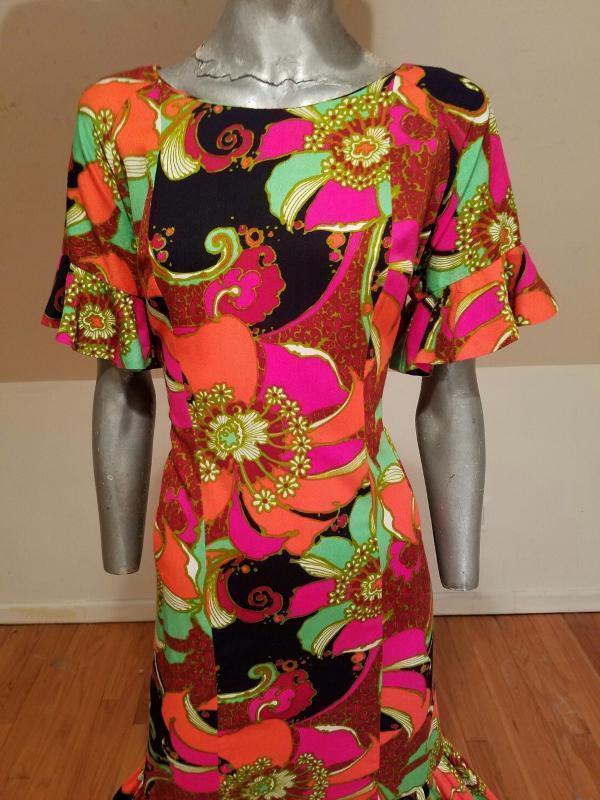 Vtg 1970s Hawaiian psychedelic floral maxi big ruffle hem dress