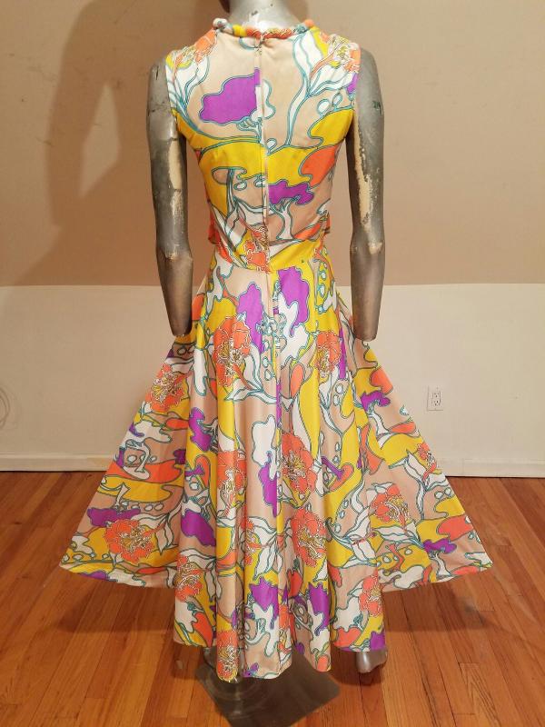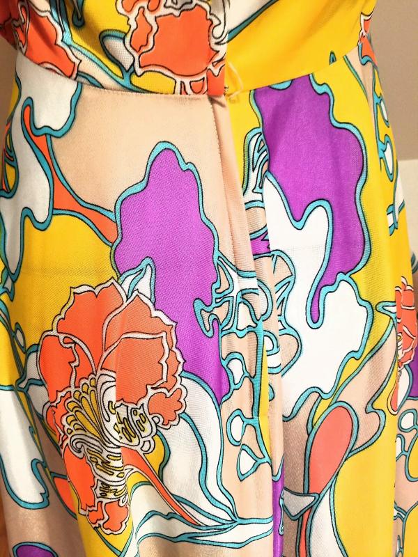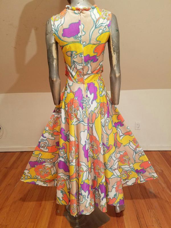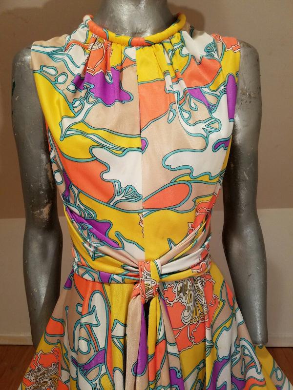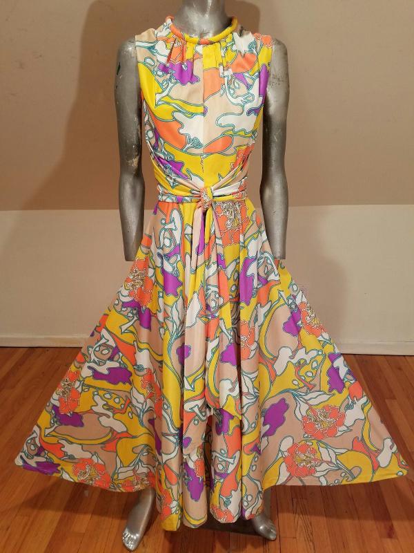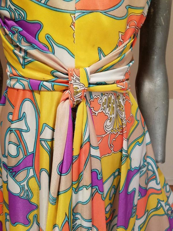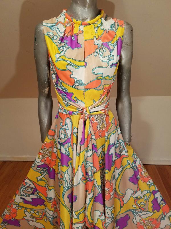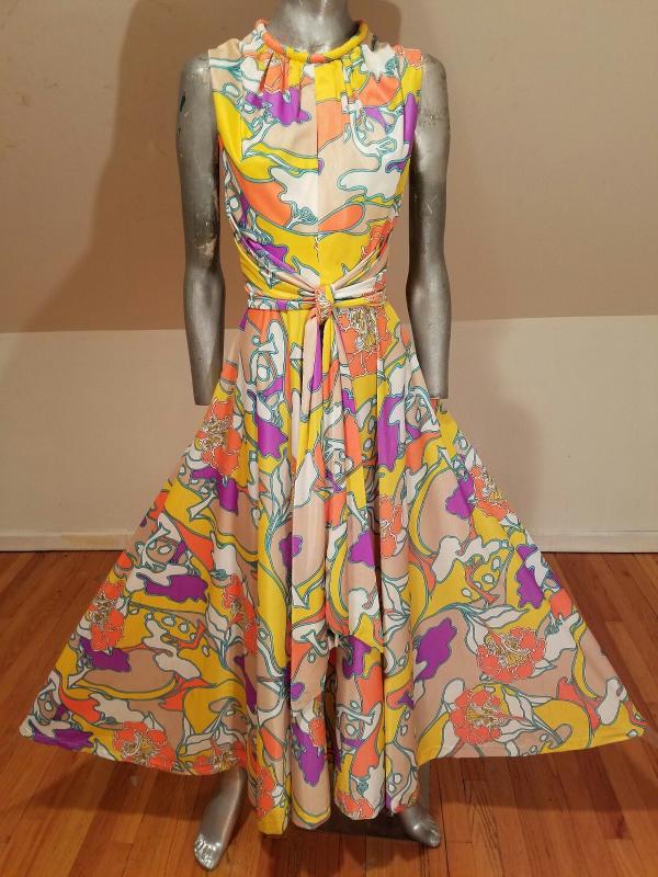 This one is a stunner. Very fluid and colorfully printed in a Pucci style. Maxi with front tie sash. This one is Gorgeous in coloration and style.
