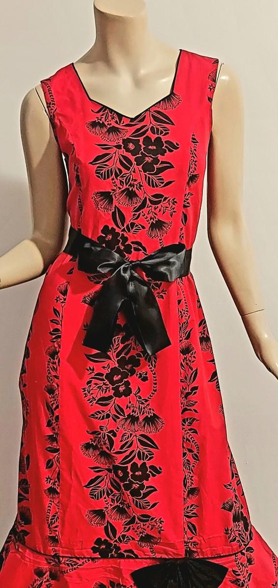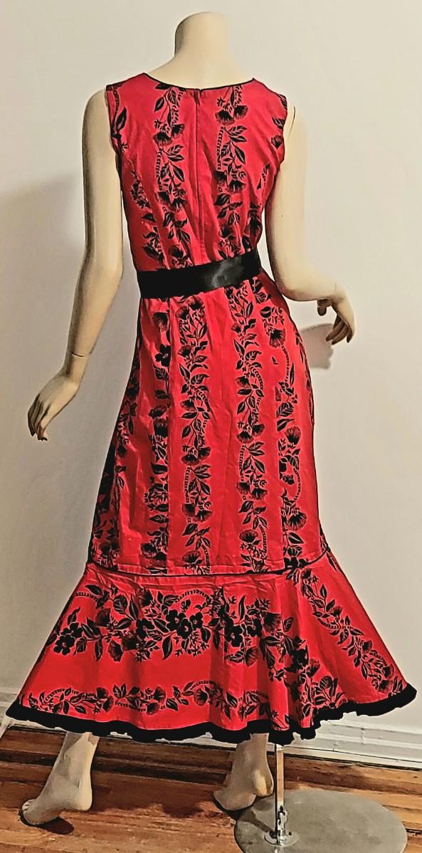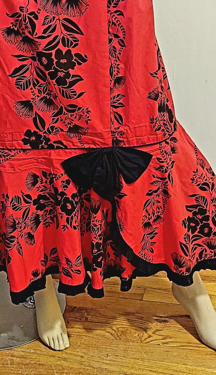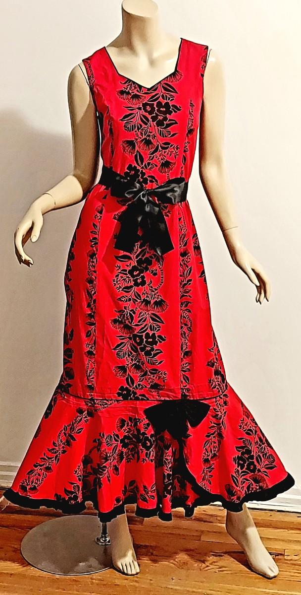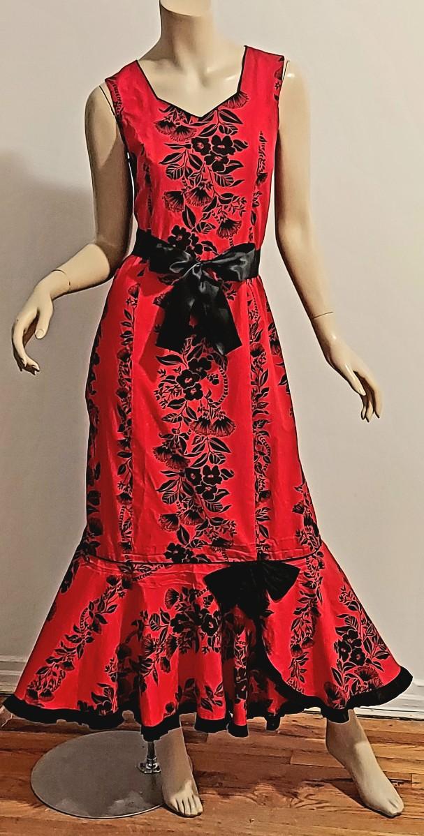 One of a kind Hawaiian Maxi Cha Cha dress With black Floral delicate print. The Hemline is Ruffled and Flared with Pussy Bow. Sleeves are Victorian Puffed. Back Zipper. This is a Magnificent Wearable Art.