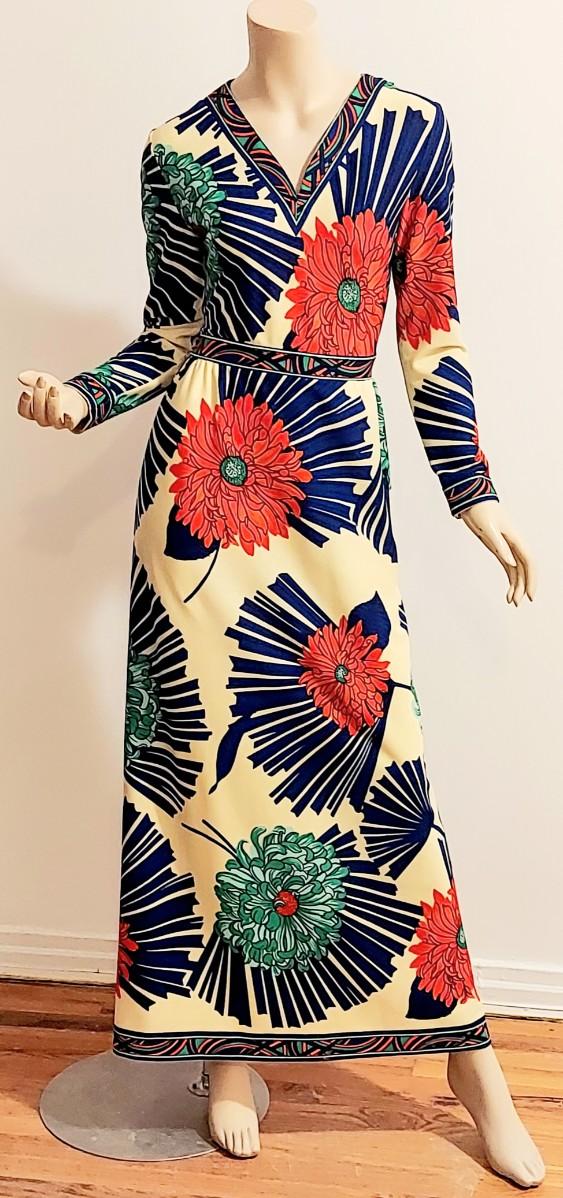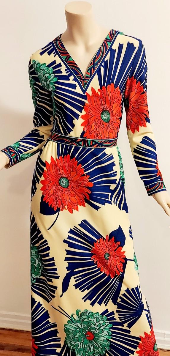 Stuning Iconic Mr. ROBERT poly jersey Maxi dress Front V. Amazing hand printed Design.