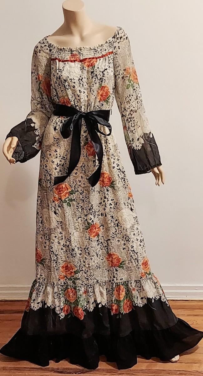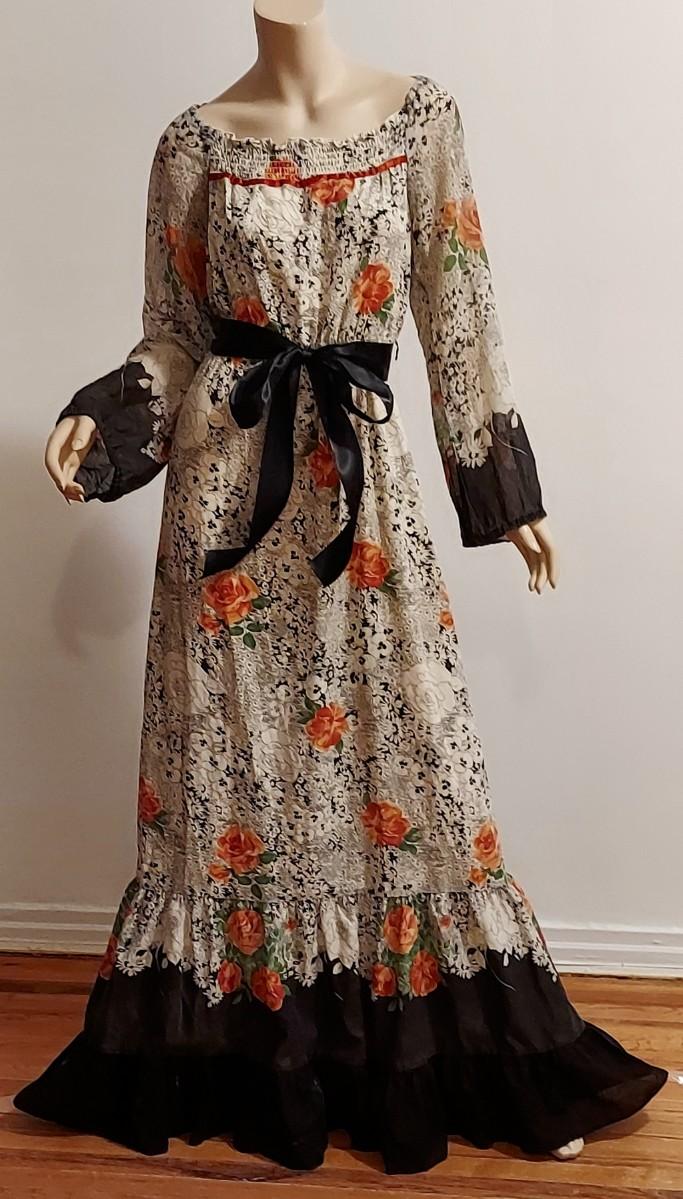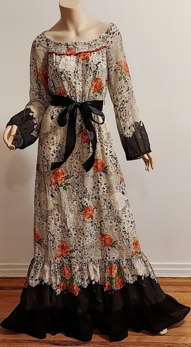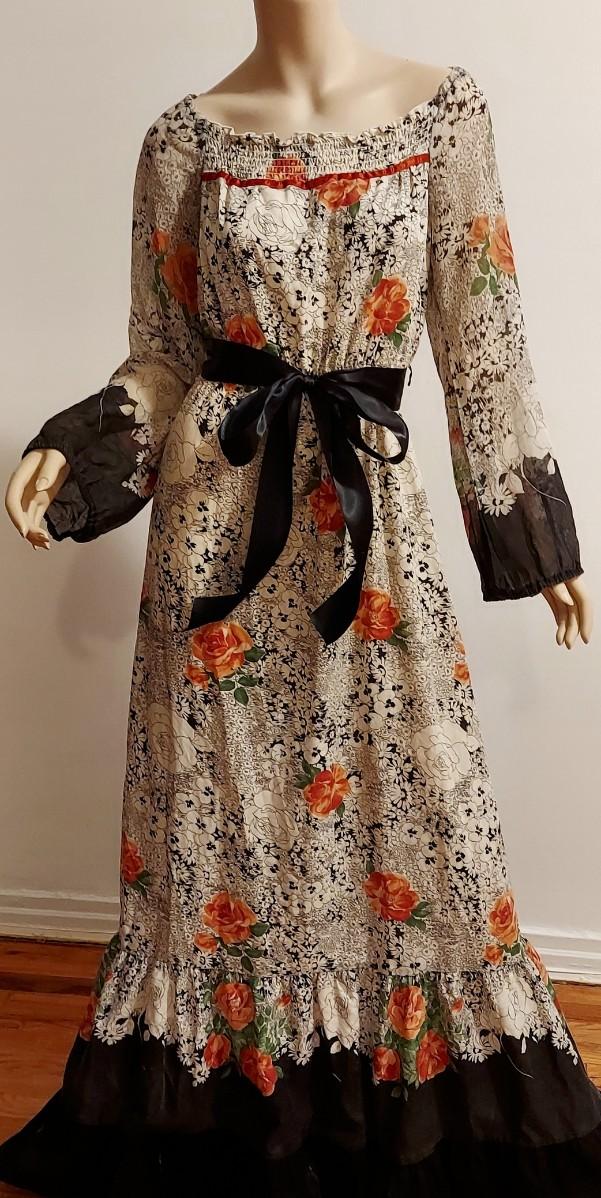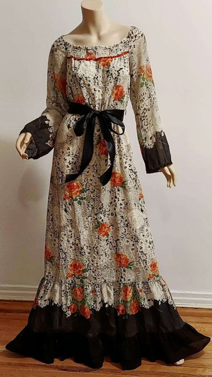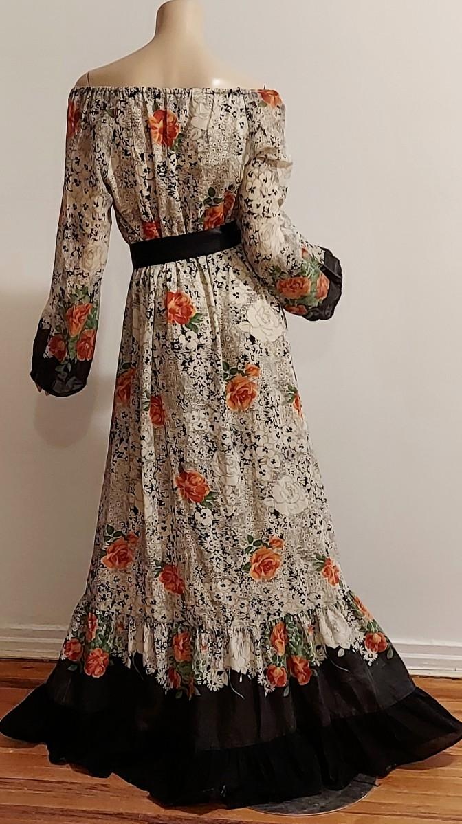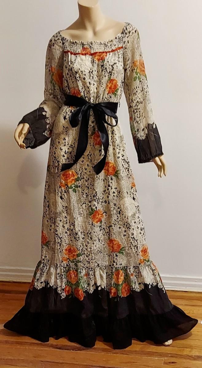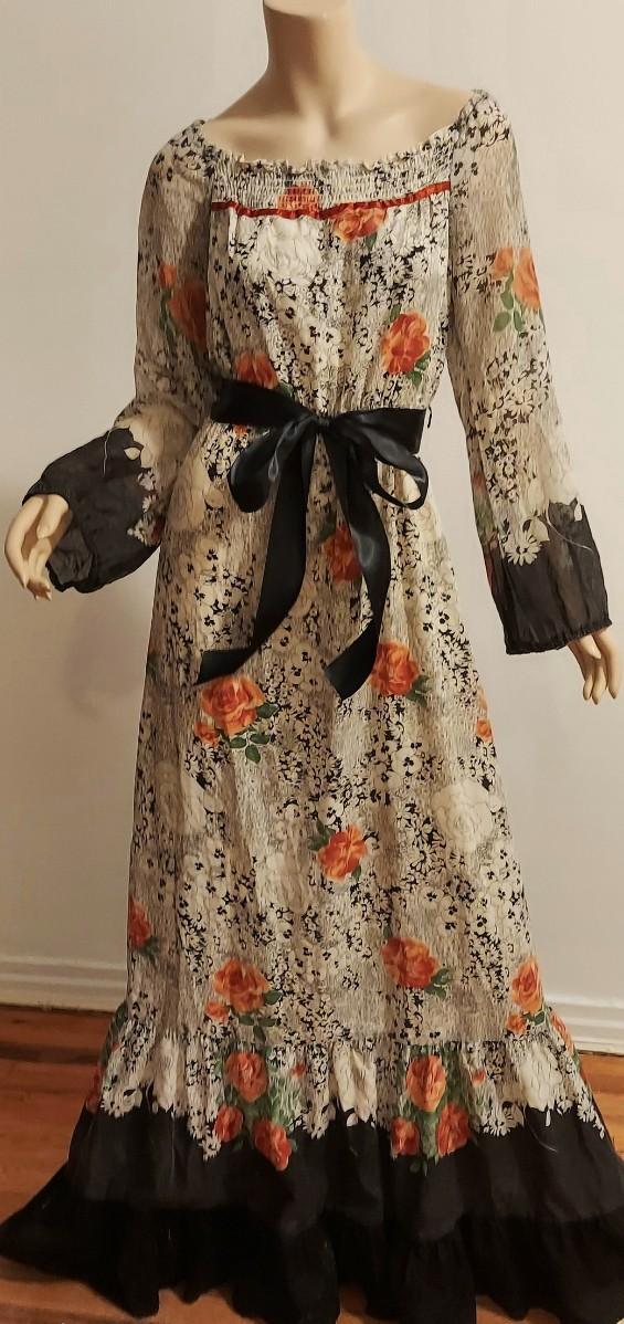 From a Bygone Era late 60s early 70s. Ruffled Hem Bell sleeves it is a Stunner. Bodice ha A bit of Elastic at Neckline so can be worn off Shoulder