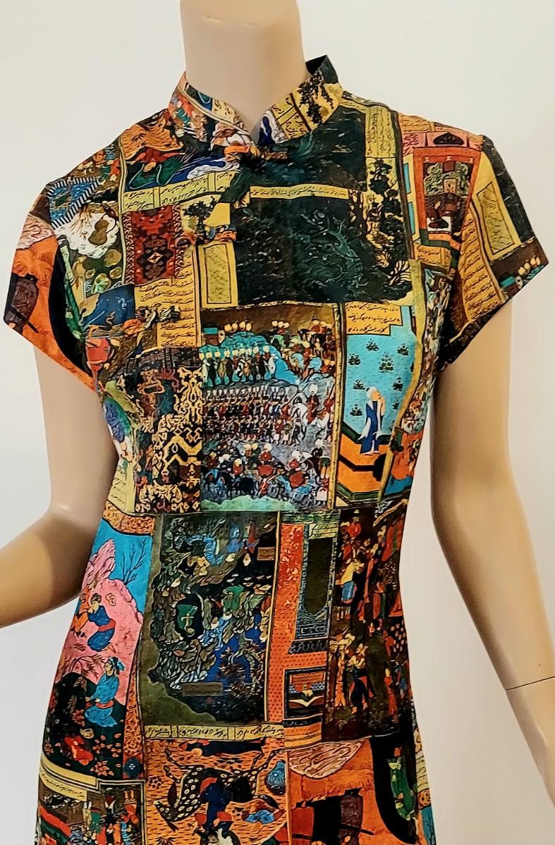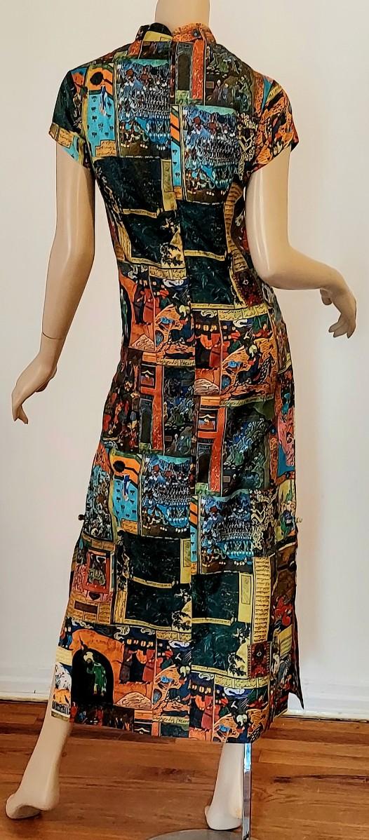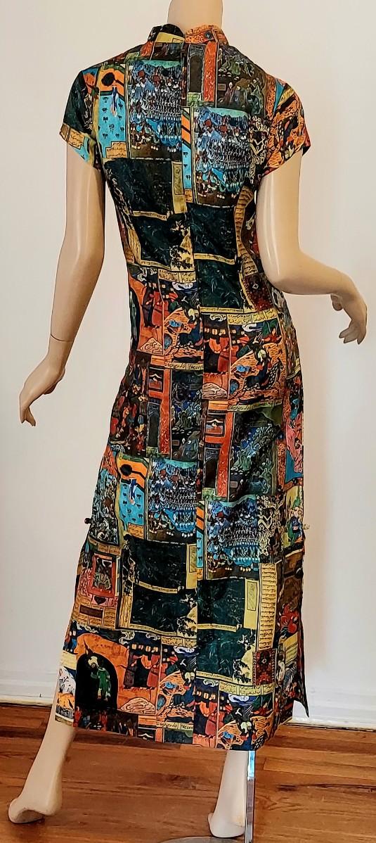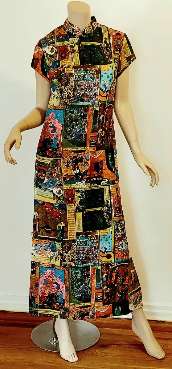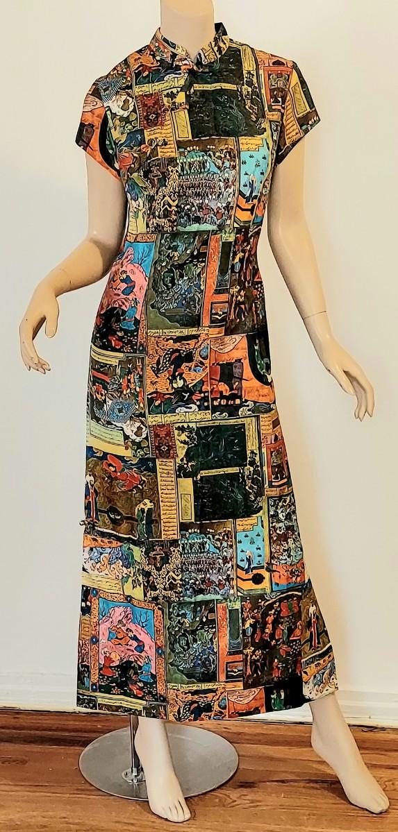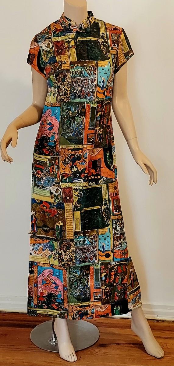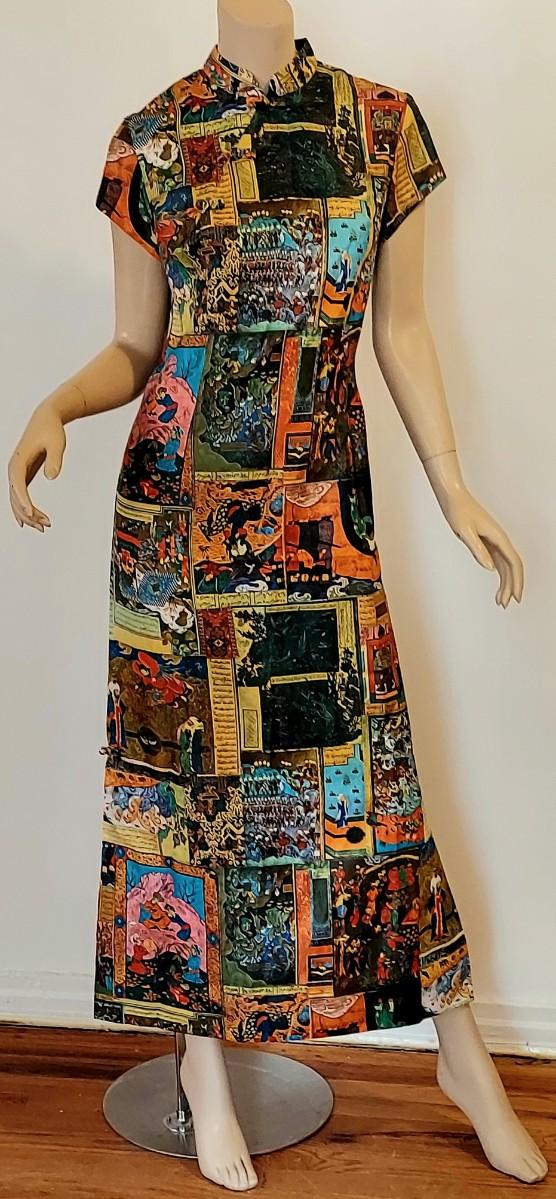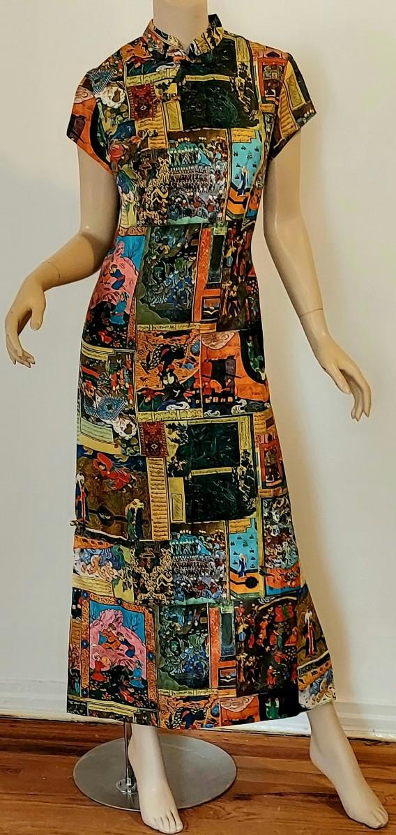 Rare timeless Maxi 60-70s Cheongsam Quipao dress by Waltah Clarke Patchwork Persian print in Amazing design