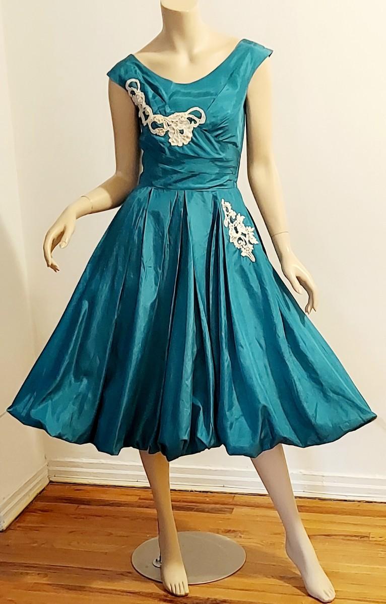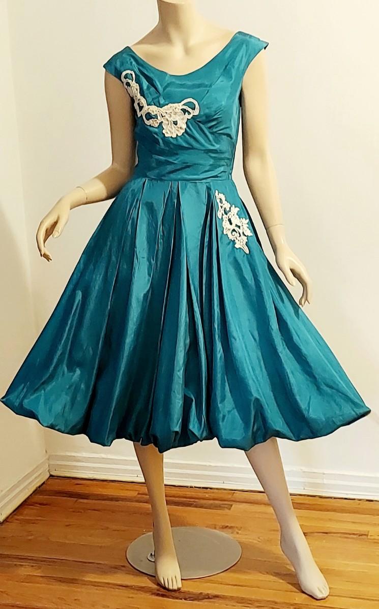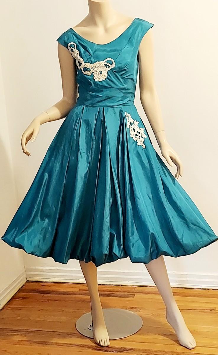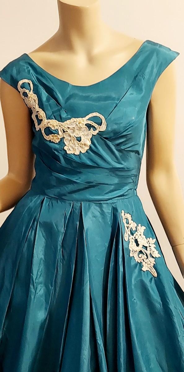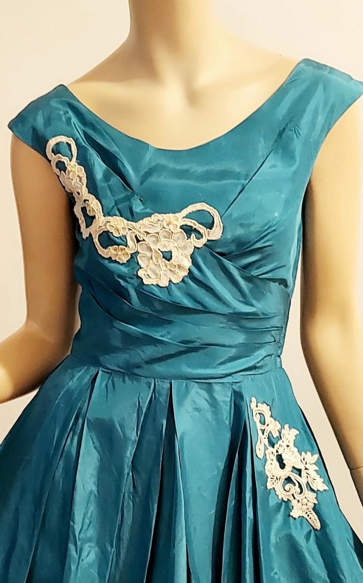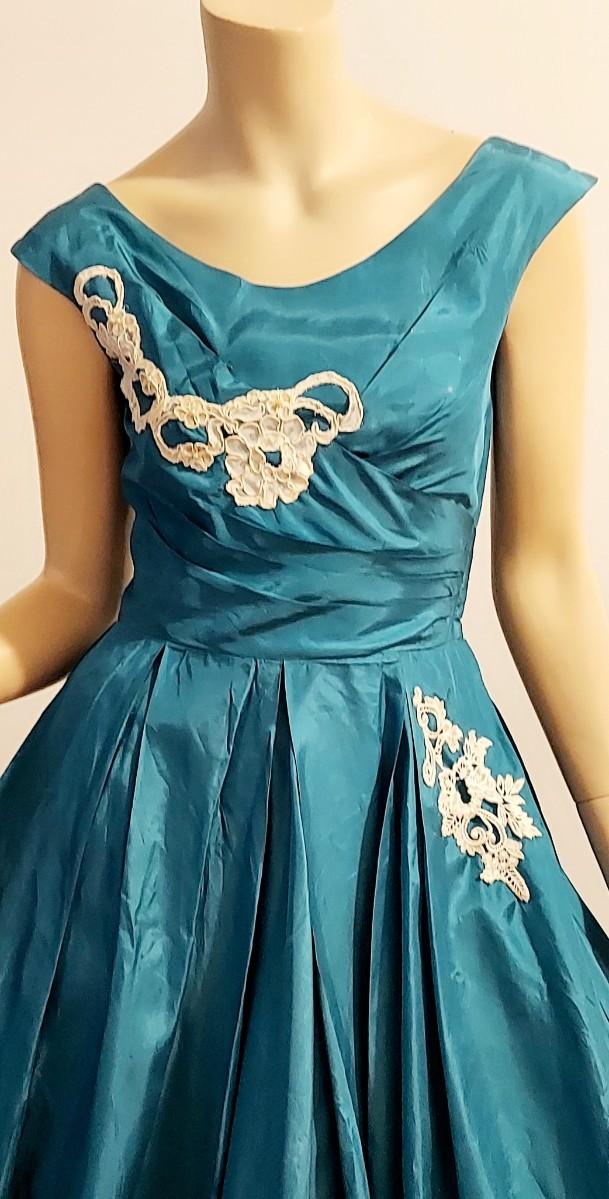 Stunning dress in a Blue/Green coloration of a Silk Shantung with its own attached Crinoline . And white Guipure Lace Appliqués details. This