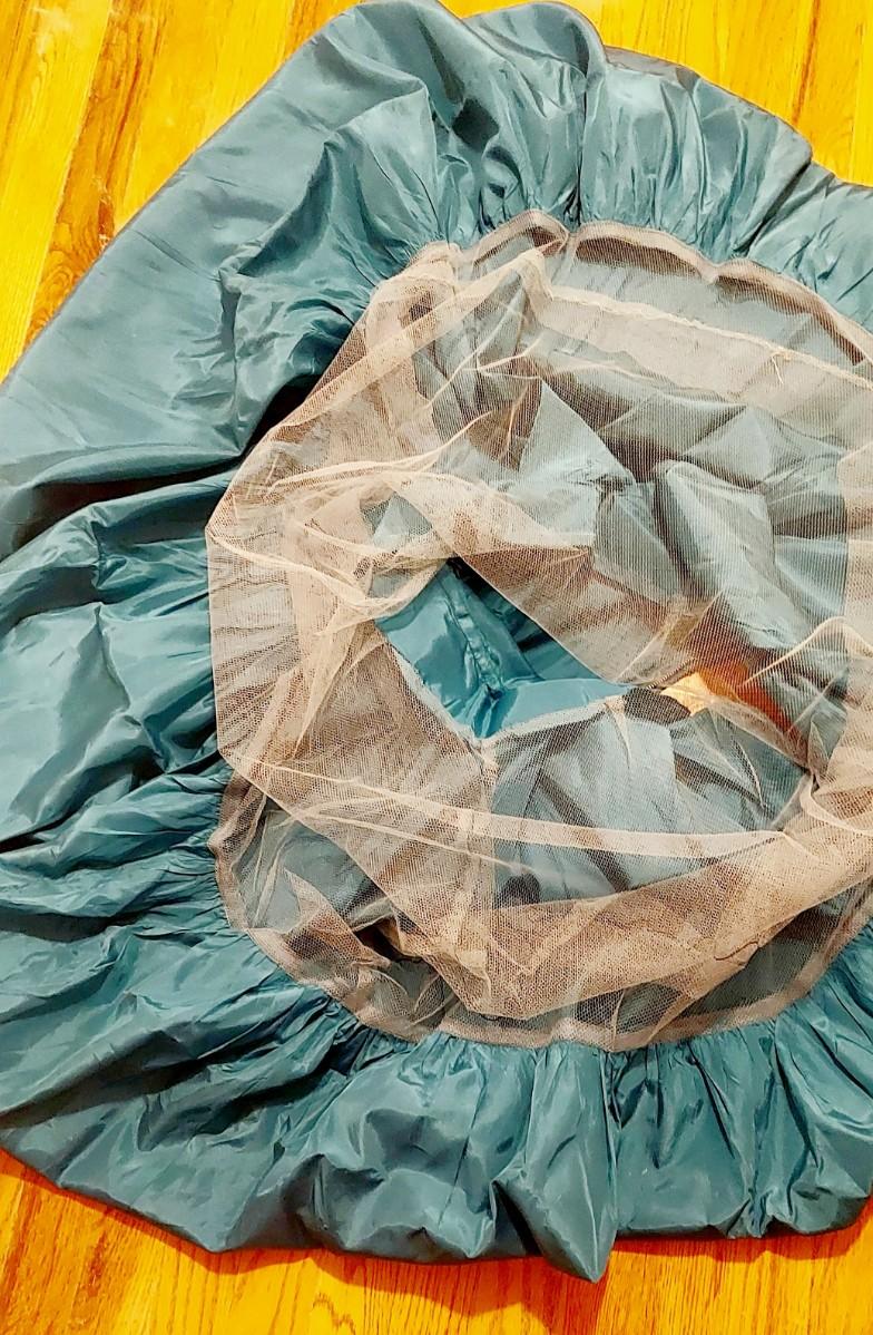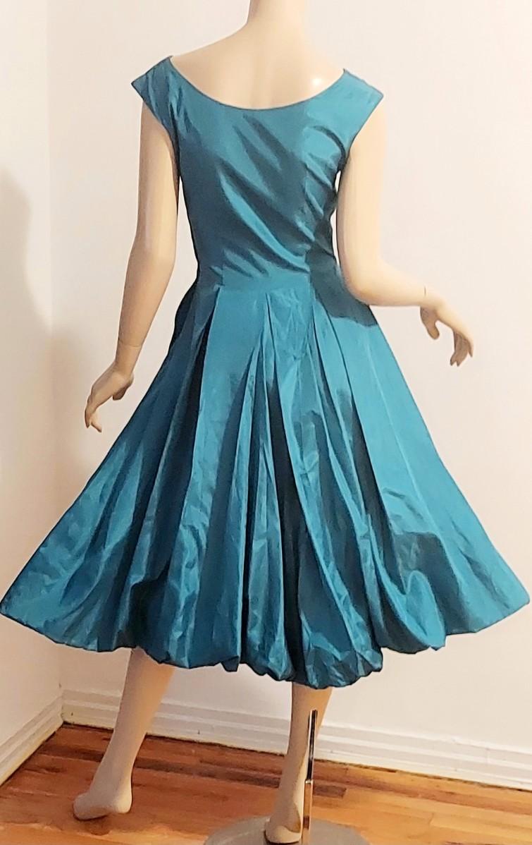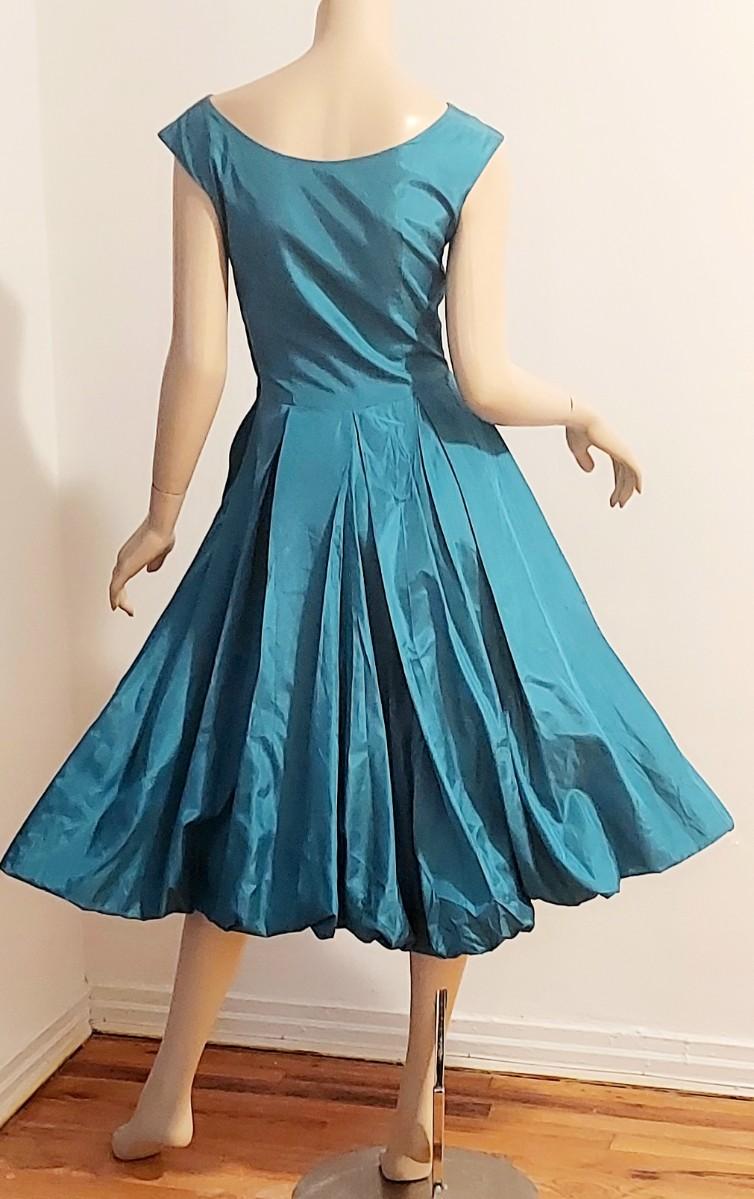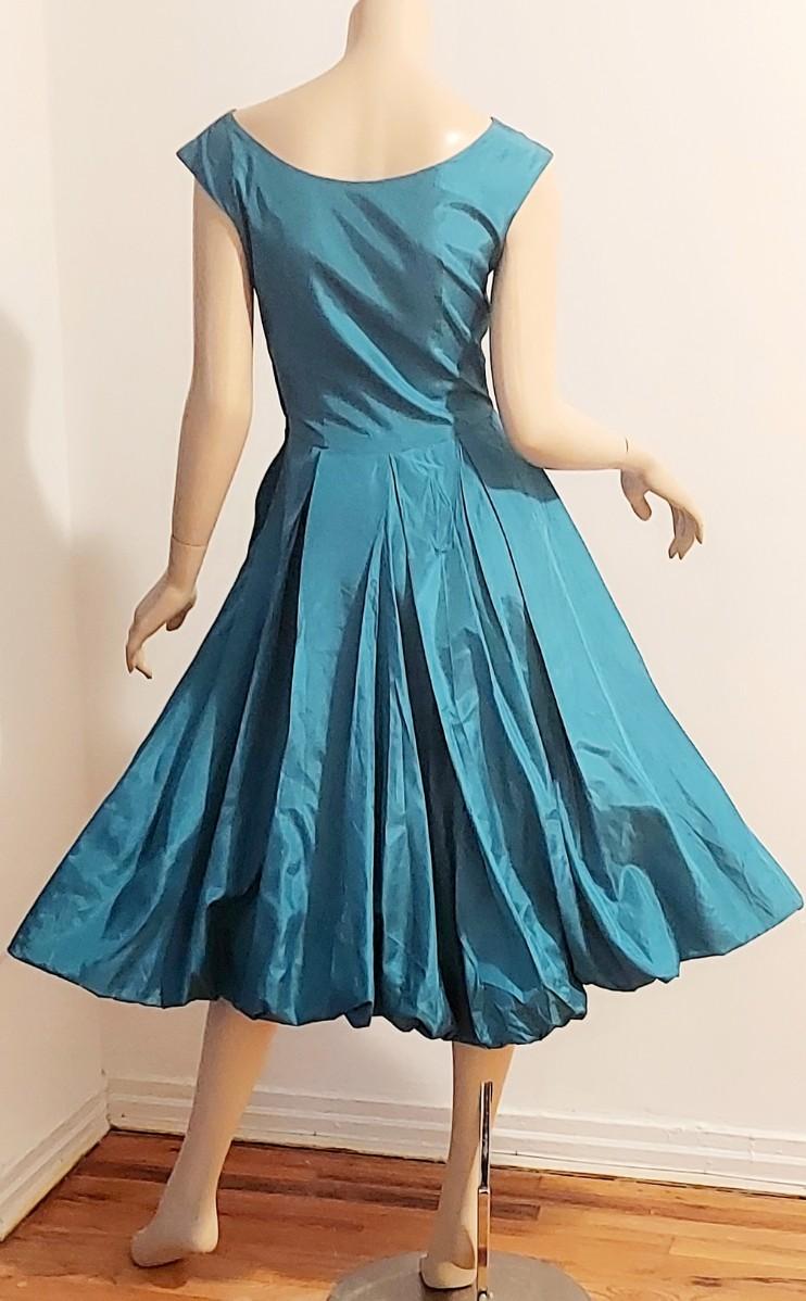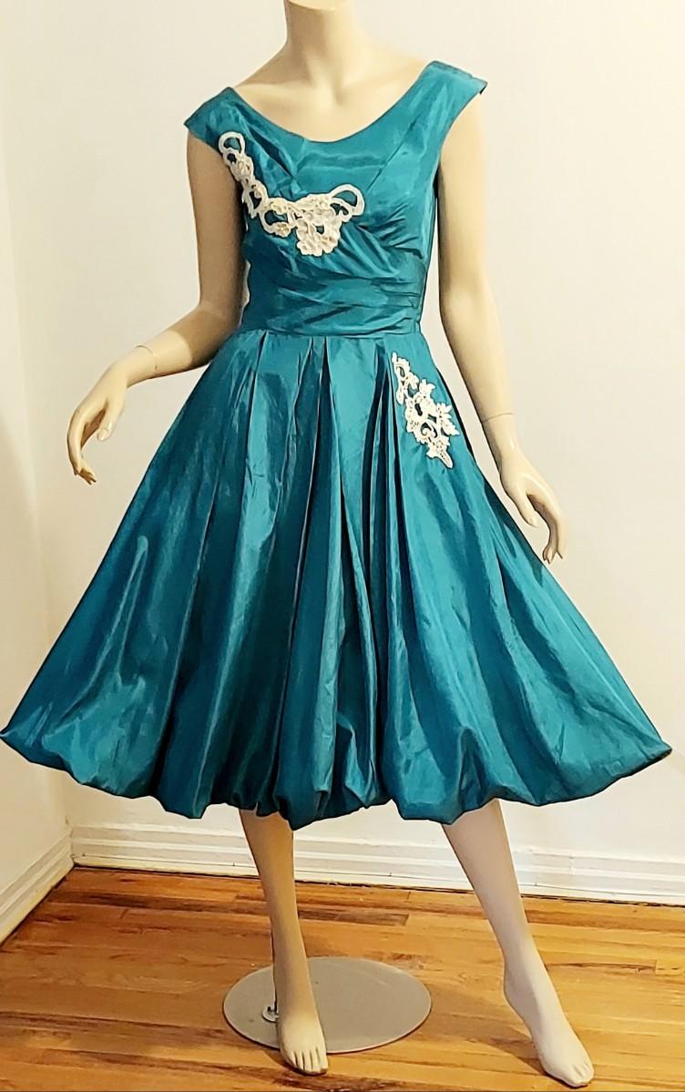 Stunning dress in a Blue/Green coloration of a Silk Shantung with its own attached Crinoline . And white Guipure Lace Appliqués details. This
