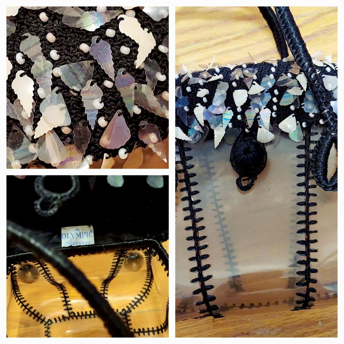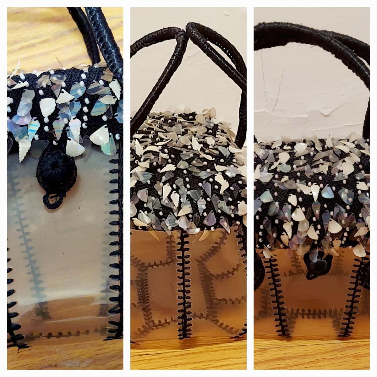 Rare item made by Hand by Artisans. Rafgia,Plastic, Macrame and Mother of Pearls parts arop. The bag opens at top and has a round Raffia Macrame Closure Buckle..