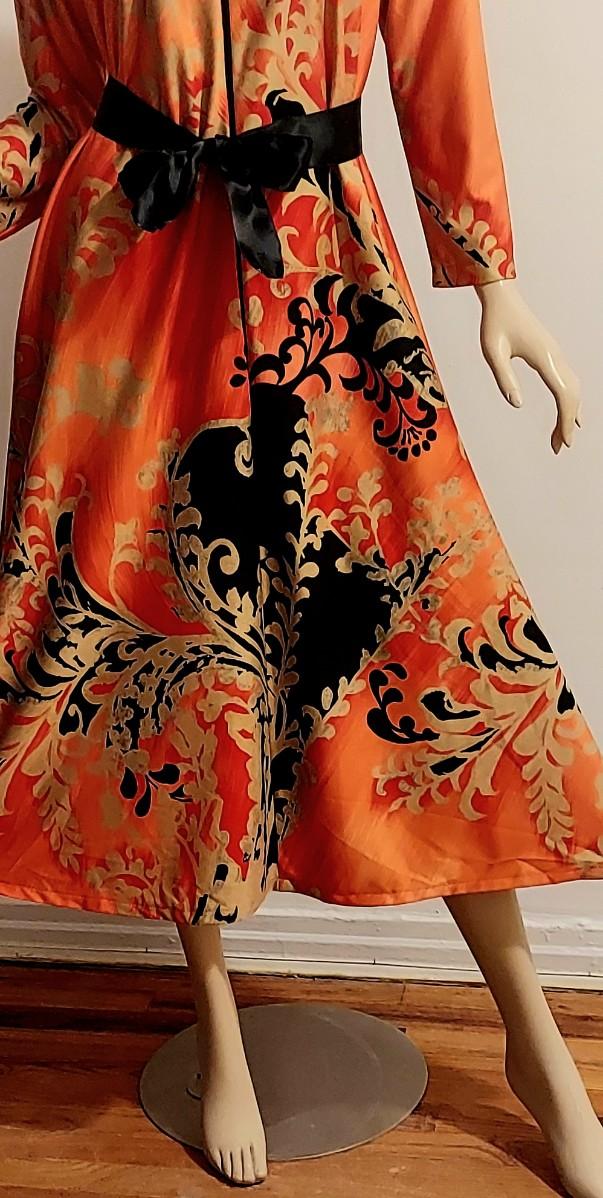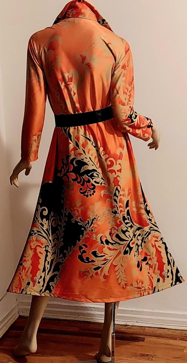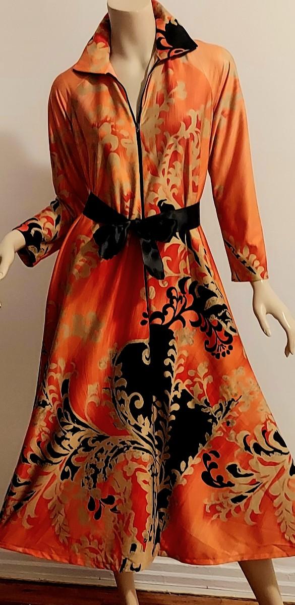 This one is Stunning in Design and Colors that are Vibrsnt and the dress is Fluid and Gorgeous. The front closure is a long Zipper and when closed it is a high Neckline.
