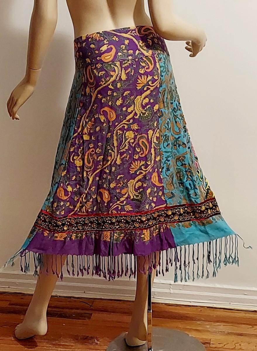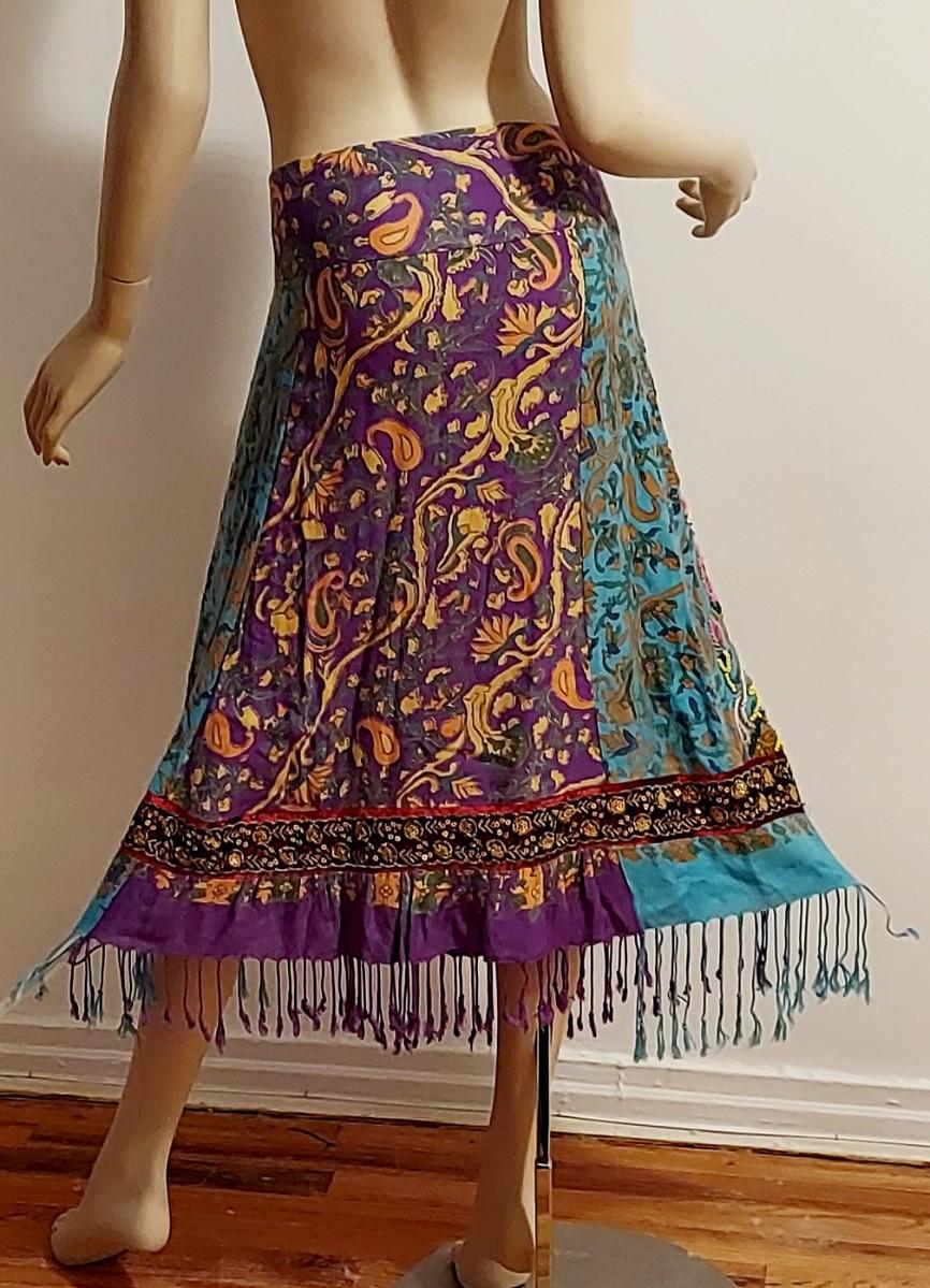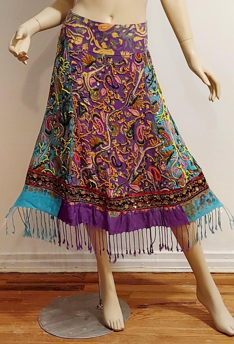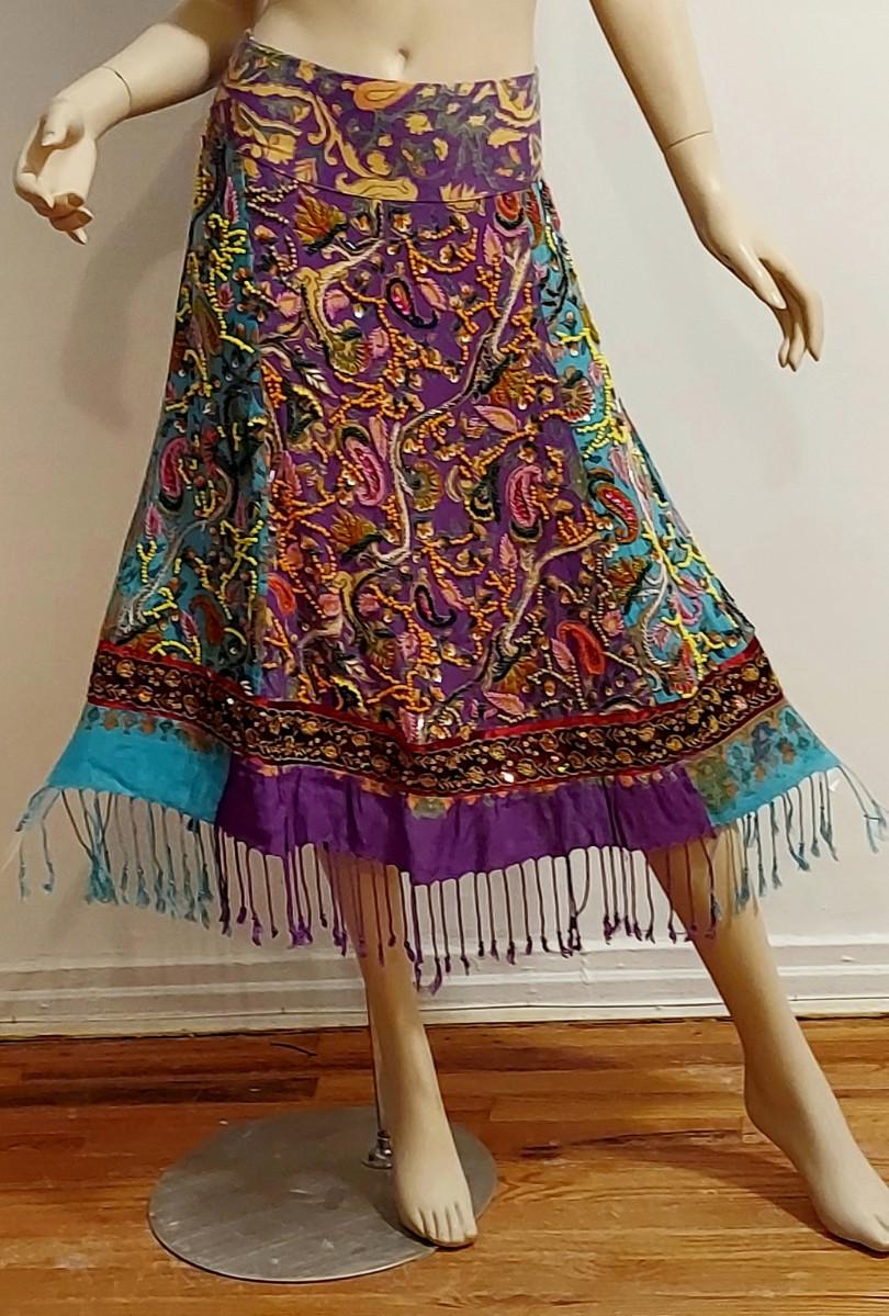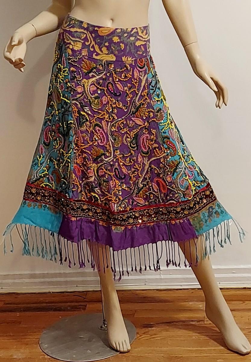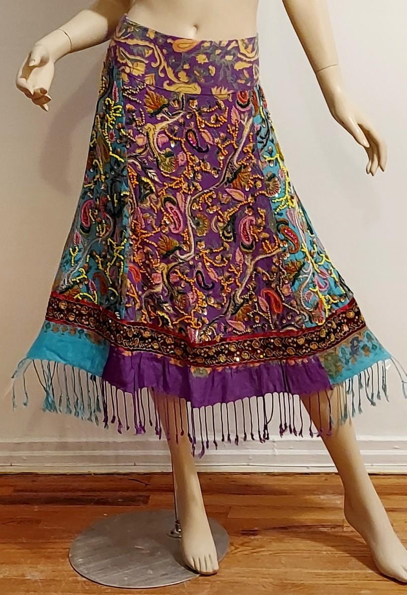 Stunning hand painted Printed Sweep cotton/Cashmere content skirt with Gold Silver Sequins.Hand embroidery in actual metal gold Thread. Hand Beaded and Fringed midi Akirt. In amazing Vtg Condition .
