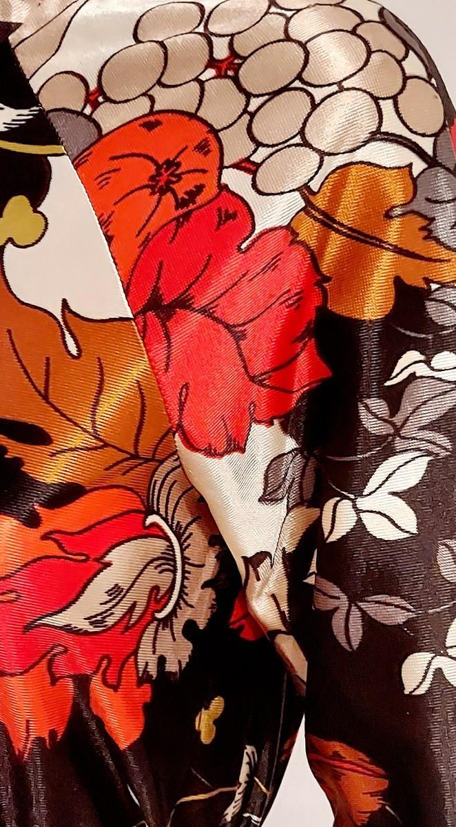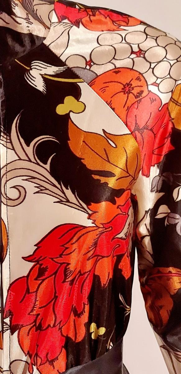 Exquisitely Stunning hand painted print in Smazing Reds,Black,Mustard. In a Silky like Acetate Fabric . Front Zipper. High Neck.