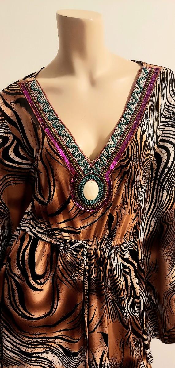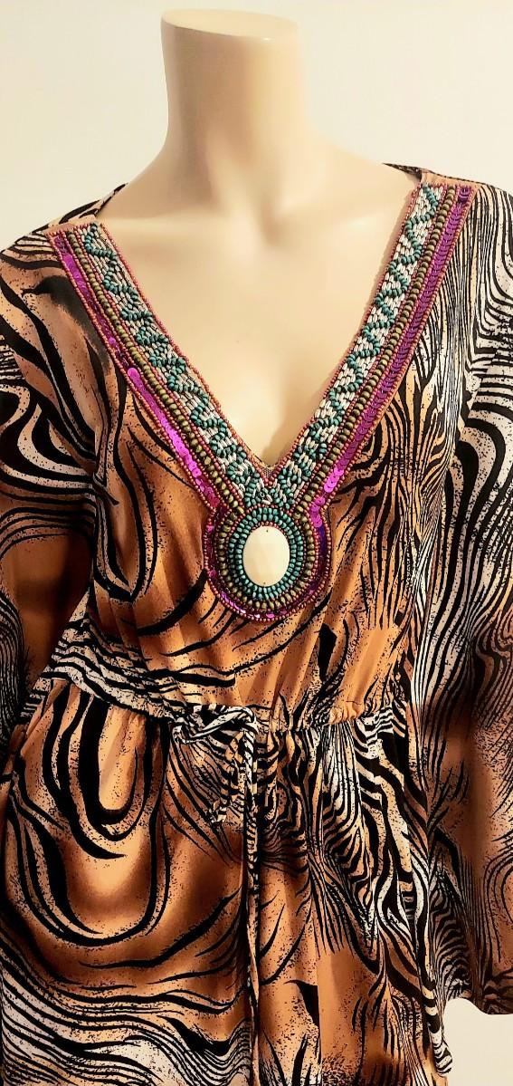 Really Stunning from years Past. An Original Frederick's of Hollywood Kaftan Tunic with heavy Embellishments at Bodice Collar that is a Deep V.