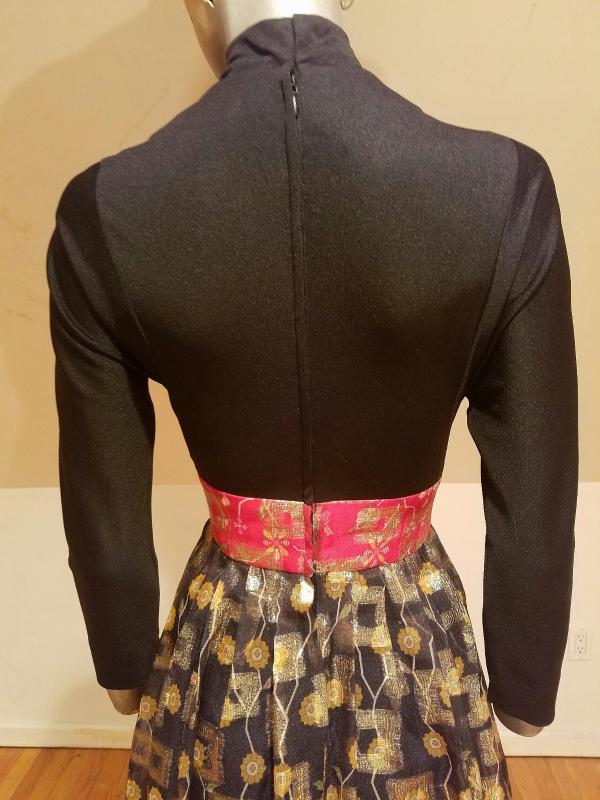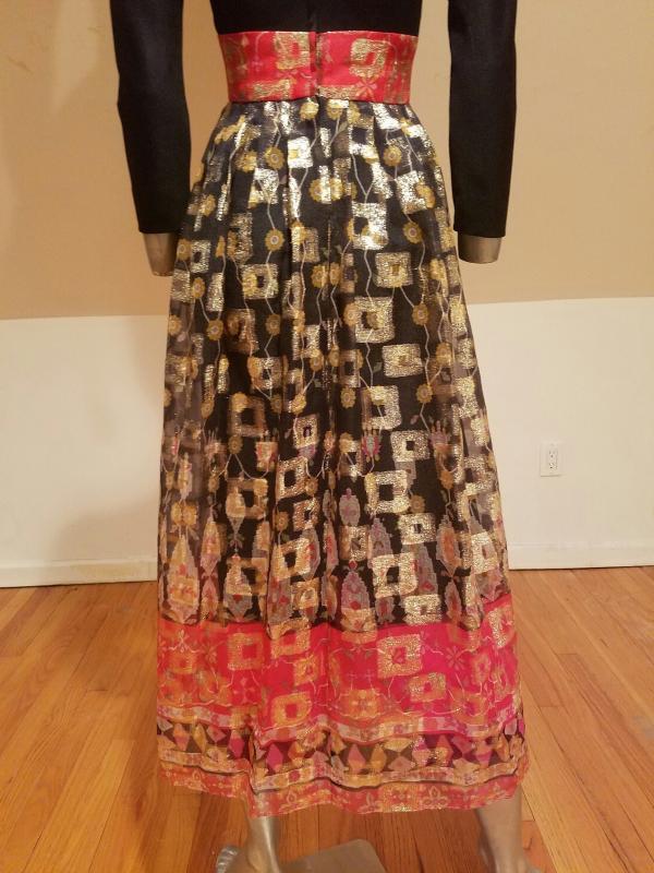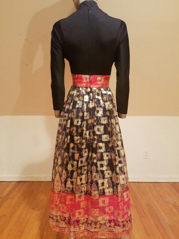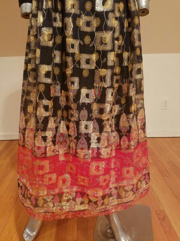 Stunning Iconic DON LUIS De ESPANA Lame' chiffon gown Ethnic print soft poly fitted bodice with mock button up front, thinly lined skirt with a sheer Organza overlay.that is all gold and red metallic print.