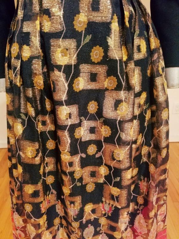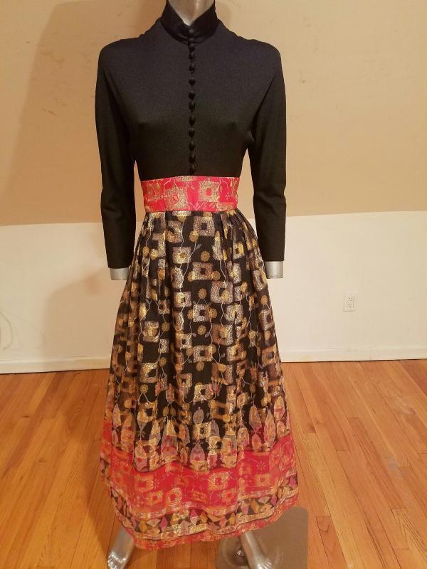 Stunning Iconic DON LUIS De ESPANA Lame' chiffon gown Ethnic print soft poly fitted bodice with mock button up front, thinly lined skirt with a sheer Organza overlay.that is all gold and red metallic print.