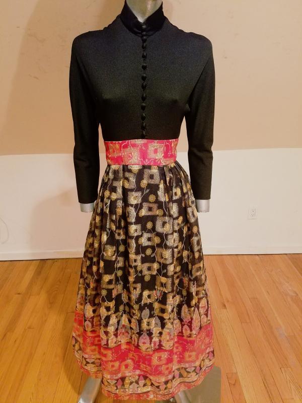Stunning Iconic DON LUIS De ESPANA Lame' chiffon gown Ethnic print soft poly fitted bodice with mock button up front, thinly lined skirt with a sheer Organza overlay.that is all gold and red metallic print.