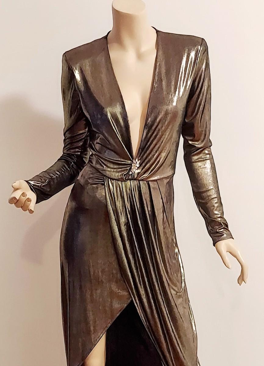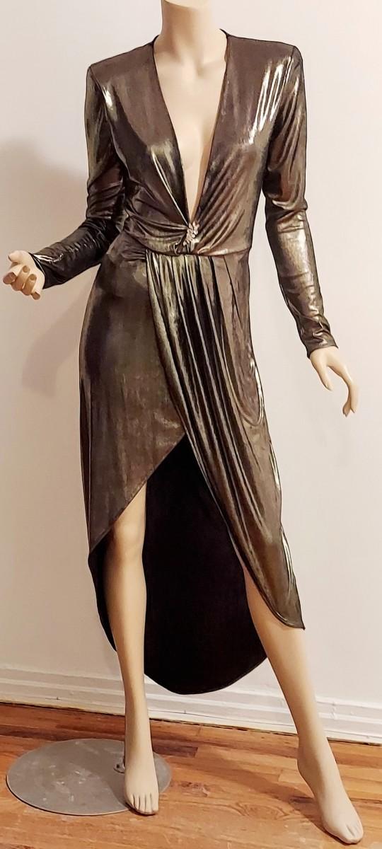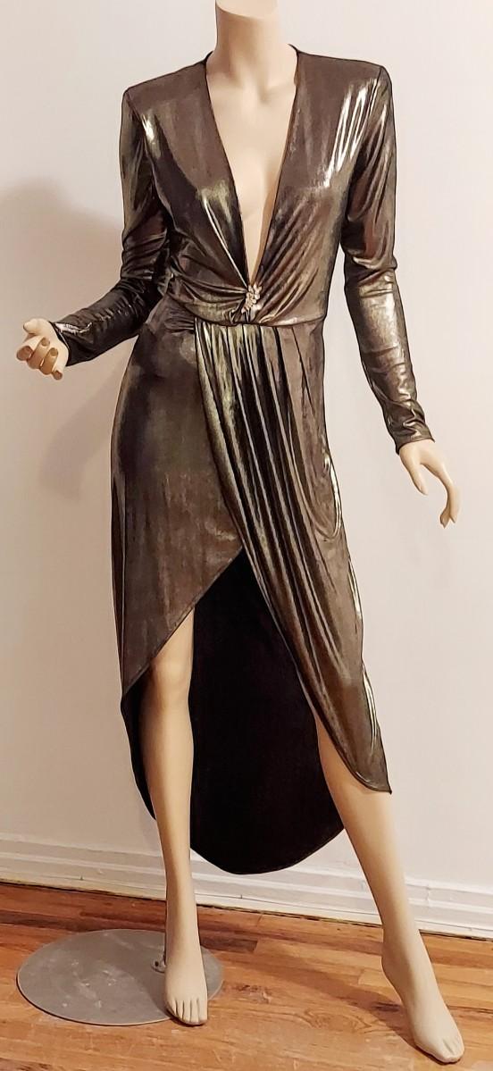 Amazing High Low liquid Metallic drapped dress with Rhinestone Brooch.