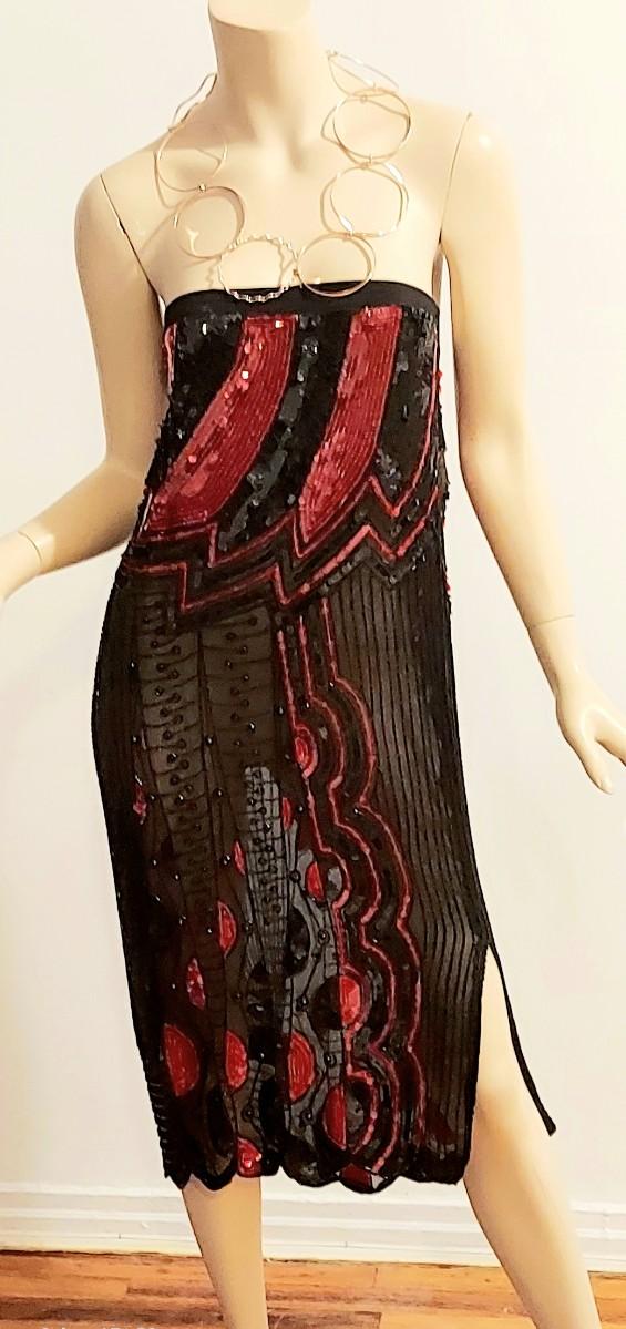 Truy A Beauty from the 1980s Silk Chiffon all hand Beaded and Sequined dress with Metal Necklace Golden look. What a Tunner this one is for the Hollidays.In amazing Vtg condition