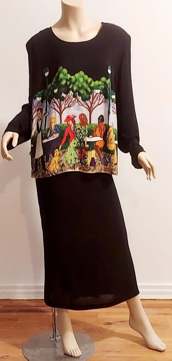What a Beauty this Maxi is .Amazing hand printed French Sidewalk Cafe scene with Elegant printed Ladies. The Top is Overlay but Attached to the dress. It is la Fine Crepe Rayon .Very Roomy and Generous in Size