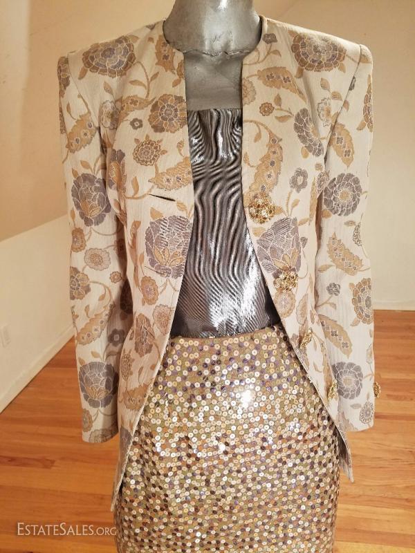 This 3 piece skirt suit from the late 1970's early 1980's by famous Albert Nipon is Majestic The jacket is a raised Brocade with gold rhinestone crystal buttons fully lined The skirt is all metallic sequins with a side zipper the tank top is fully metallic lame' and a beauty. worn once for Runway only so it is like new