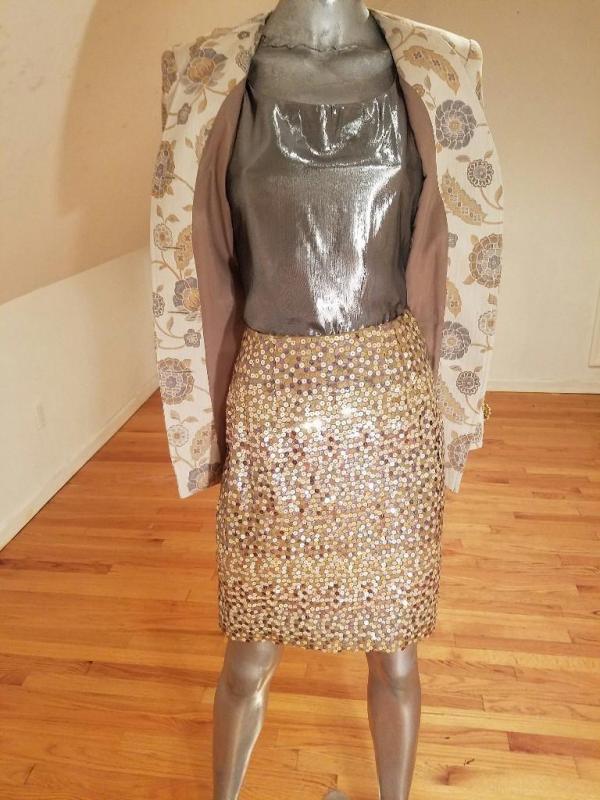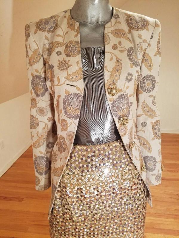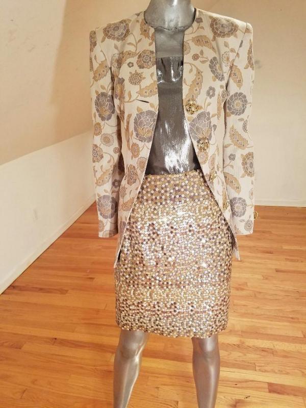 This 3 piece skirt suit from the late 1970's early 1980's by famous Albert Nipon is Majestic The jacket is a raised Brocade with gold rhinestone crystal buttons fully lined The skirt is all metallic sequins with a side zipper the tank top is fully metallic lame' and a beauty. worn once for Runway only so it is like new
