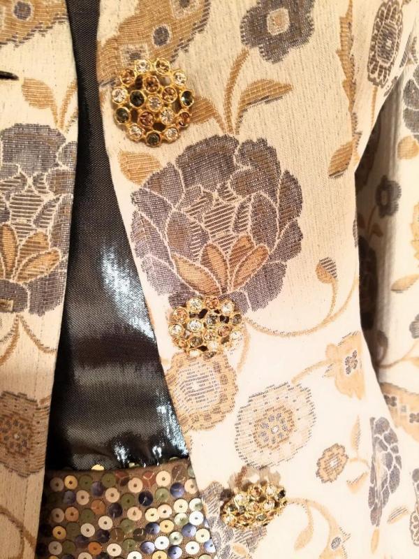 This 3 piece skirt suit from the late 1970's early 1980's by famous Albert Nipon is Majestic The jacket is a raised Brocade with gold rhinestone crystal buttons fully lined The skirt is all metallic sequins with a side zipper the tank top is fully metallic lame' and a beauty. worn once for Runway only so it is like new
