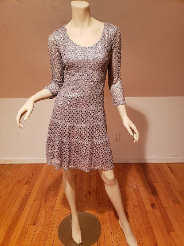 A gorgeous Metallic silver macrame dress. In the wiggle style with a Taupe underlayer to form a skin illusion. In very good vintage condition like new