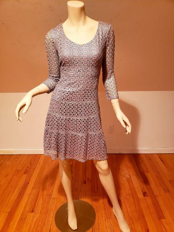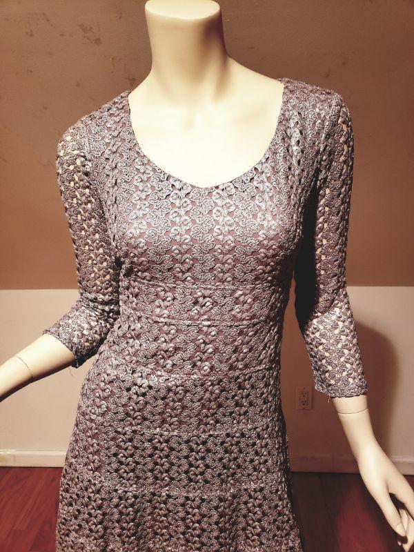 A gorgeous Metallic silver macrame dress. In the wiggle style with a Taupe underlayer to form a skin illusion. In very good vintage condition like new