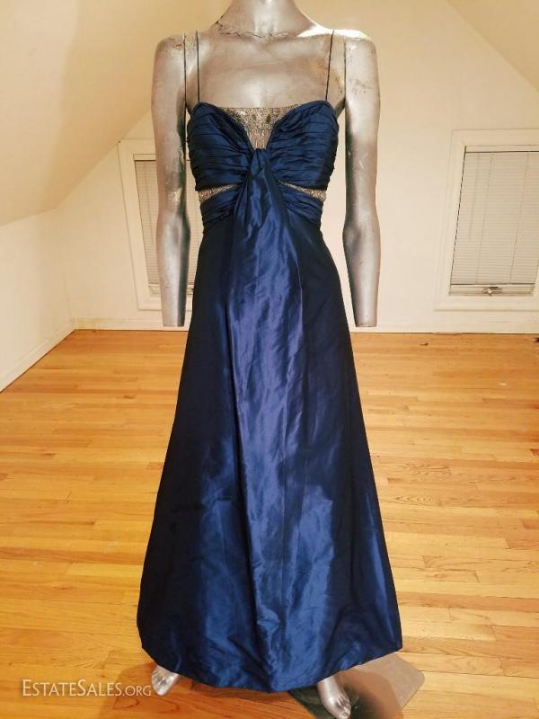 A silk shantung in an azul cobalt blue by famous Badgley Mischka embellished at empire shirred front in silver beads on a net has an empire sash with a waterfall detail front fully lined and in very good vintage condition. except for a slight tear at the bottom of the inside lining that can be easily