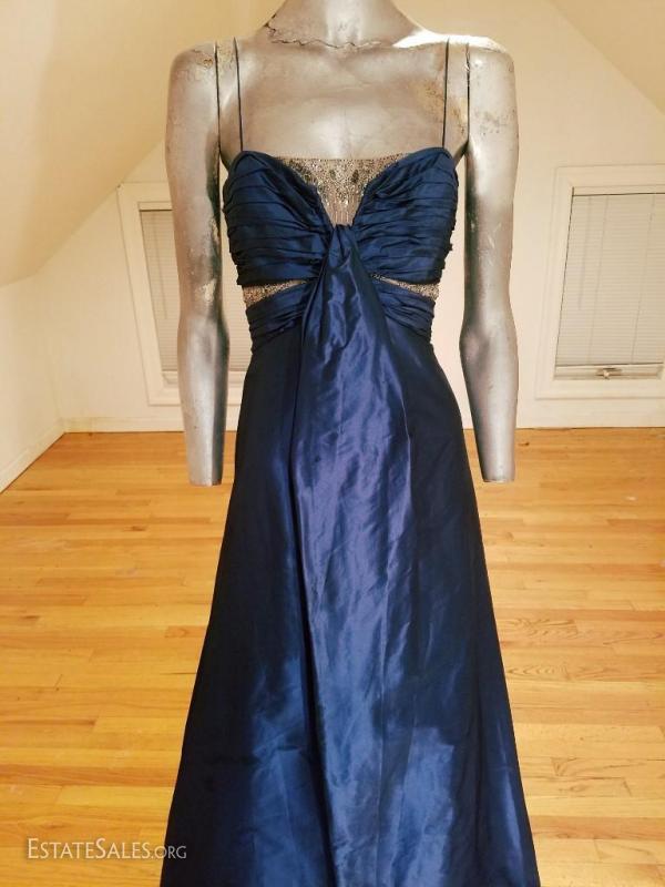 A silk shantung in an azul cobalt blue by famous Badgley Mischka embellished at empire shirred front in silver beads on a net has an empire sash with a waterfall detail front fully lined and in very good vintage condition. except for a slight tear at the bottom of the inside lining that can be easily