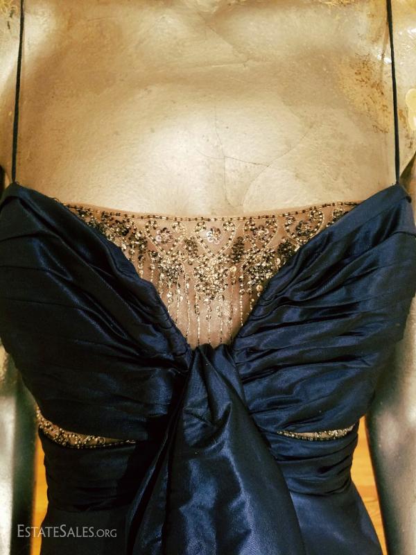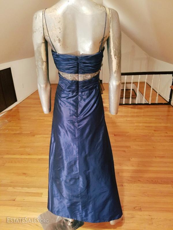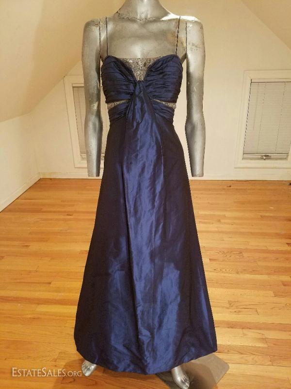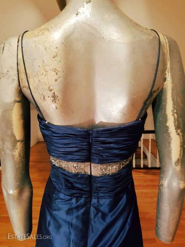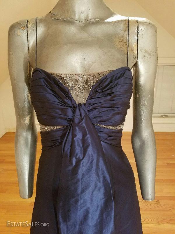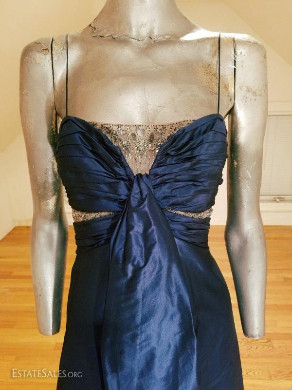A silk shantung in an azul cobalt blue by famous Badgley Mischka embellished at empire shirred front in silver beads on a net has an empire sash with a waterfall detail front fully lined and in very good vintage condition. except for a slight tear at the bottom of the inside lining that can be easily
