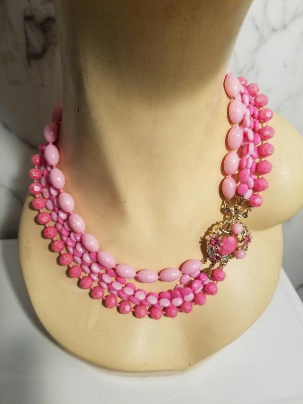 Vtg Bead Necklace multi strand Pink Enamel & rhinestone clasp  Choker Style