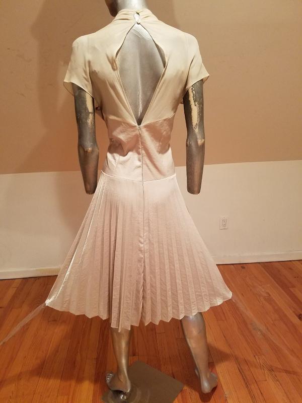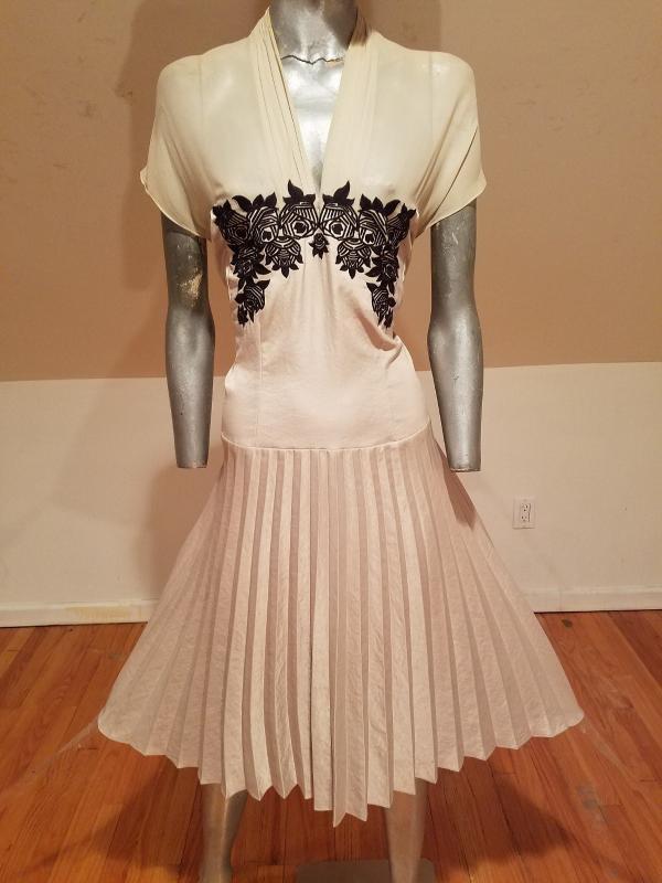 Vtg Beige Floral embroidered satin pleated dress chiffon bodice