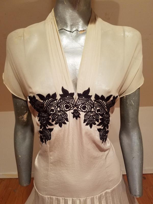 A beauty from the 1960's with accordion pleated skirt that is fluid. Top bodice is a silk chiffon with stunning floral embroidery in black .