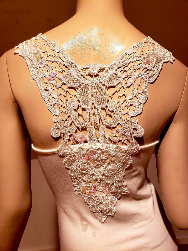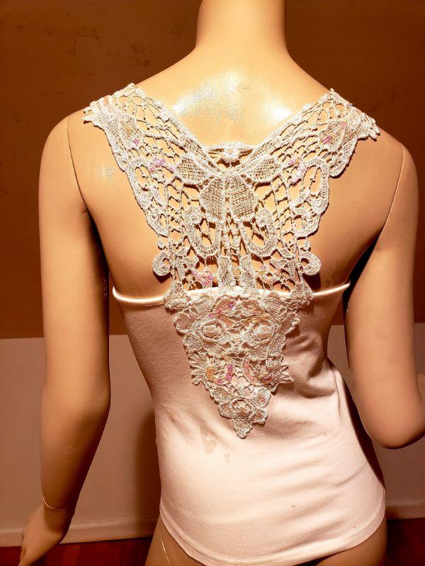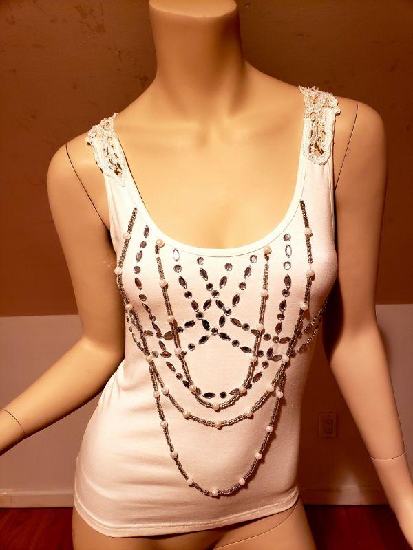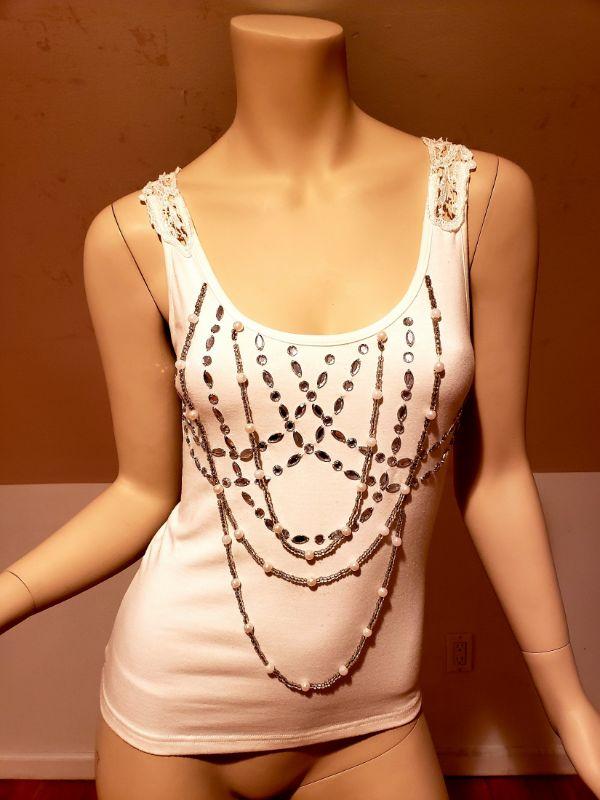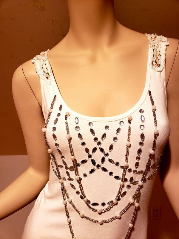 Cotton top with a bit of stretch ,jewelled with front chains and back macrame.