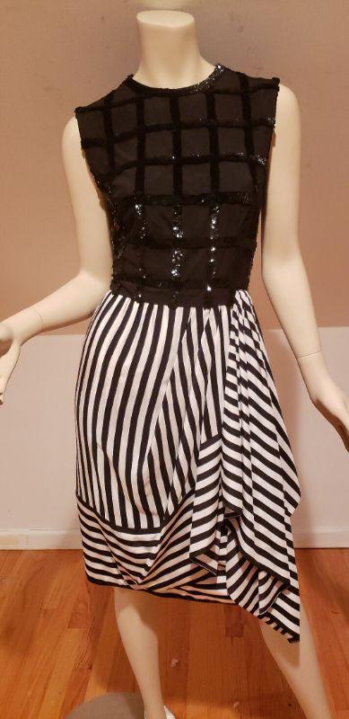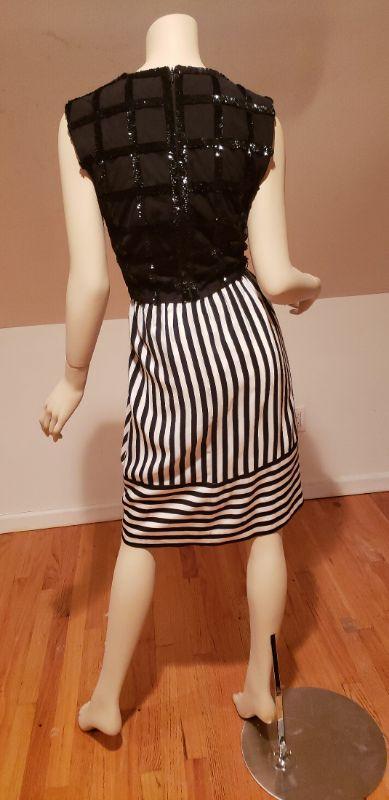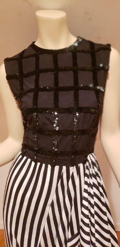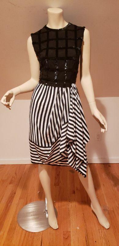 Amazing Bill Blass evening couture dress . Skirt is a luxurious silk stripe pleated and demi draped to the side. Contrast band Hemline. The bodice is sequins in a square grid pattern. A size vintag 10-M