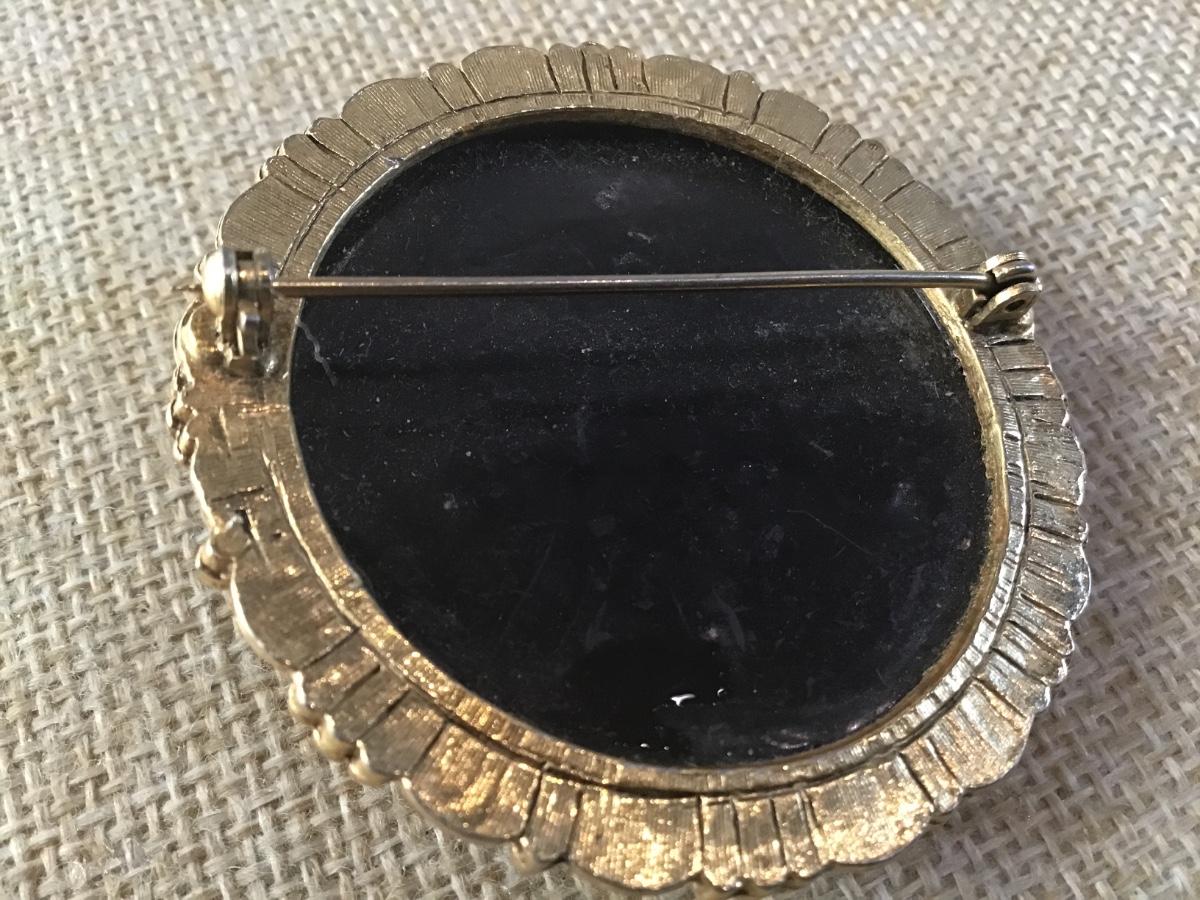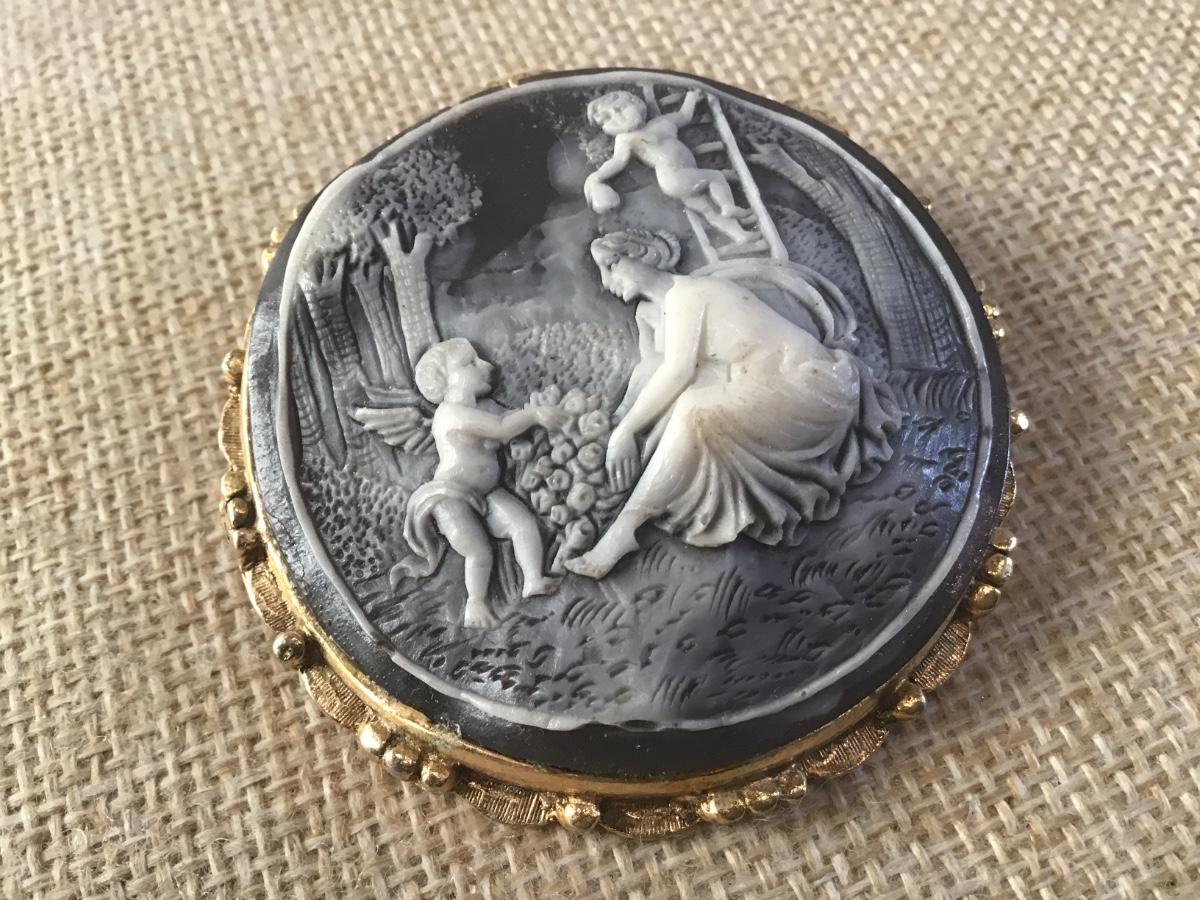 Vtg Black White Celluloid Cherub Angel Victoria Garden Scene Cameo Brooch Pin 2”