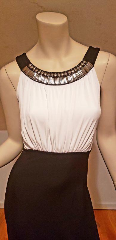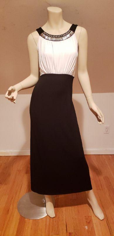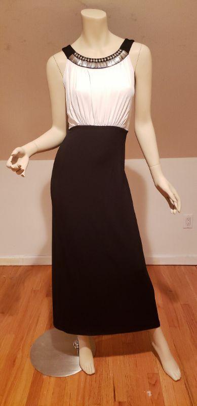Beautiful dress with silver metal Egyptian revival neckline color block maxi hostess dress, jersey fluid fabtic.