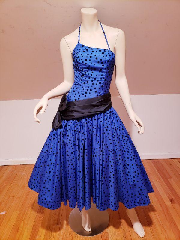 Vtg Blue Azul Asymetrical shantung Ball Gown velour polka dots