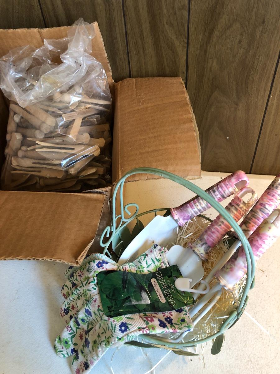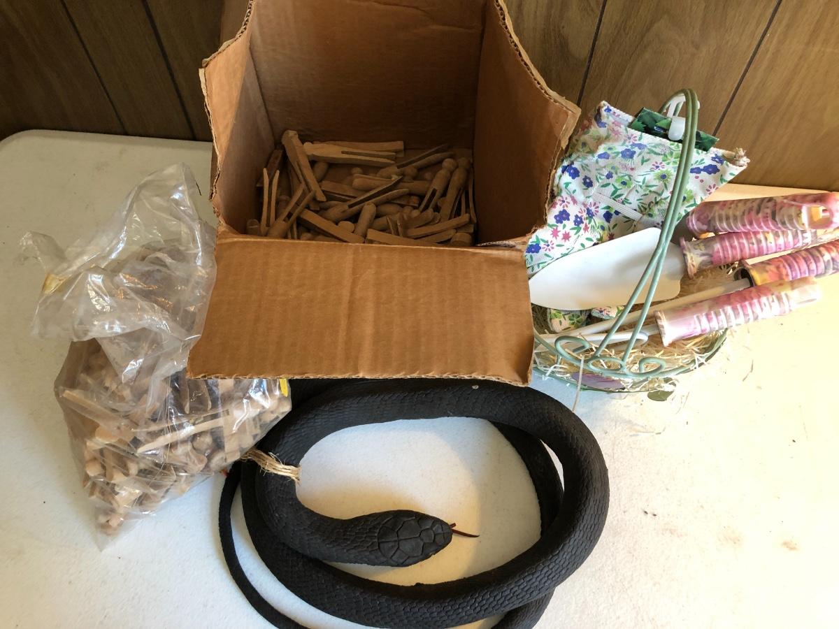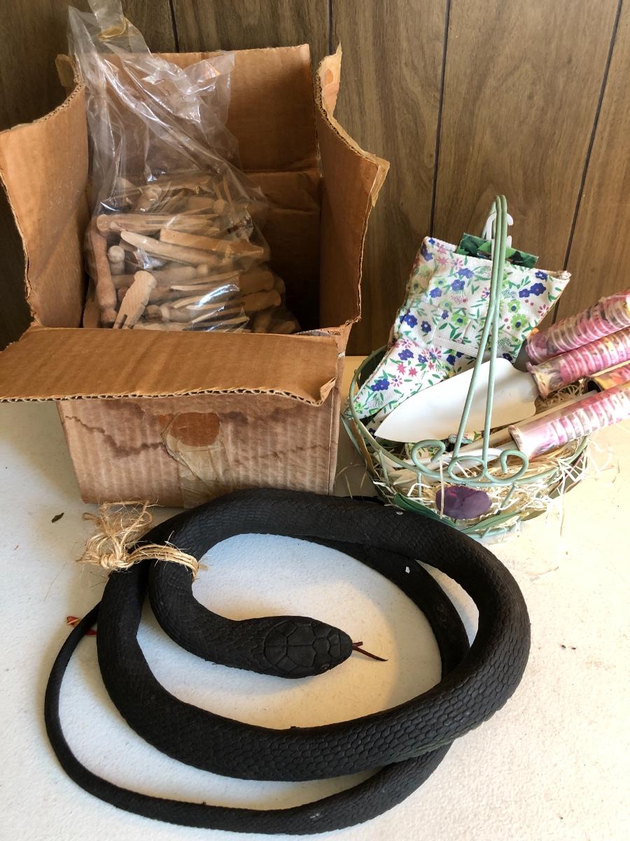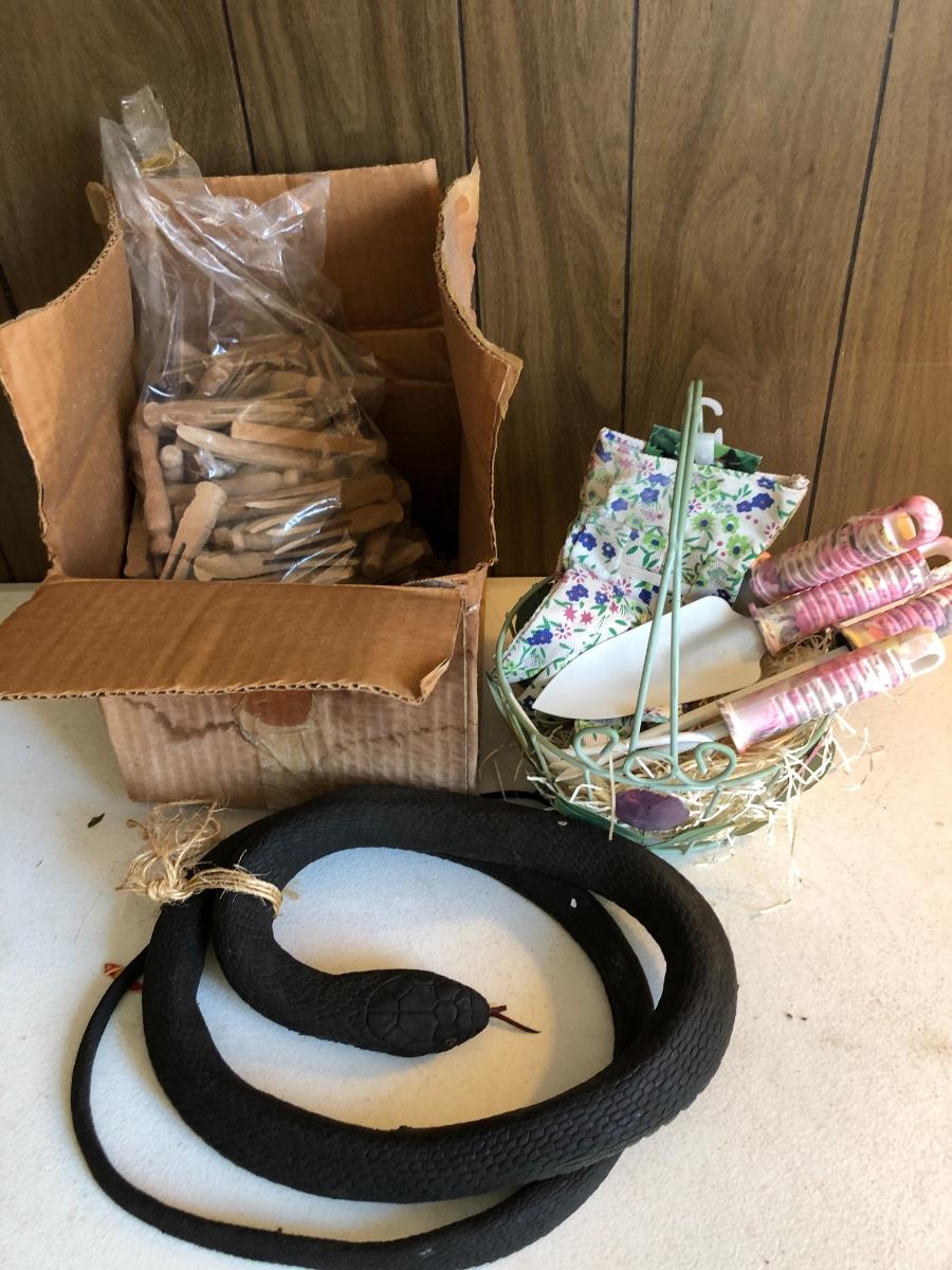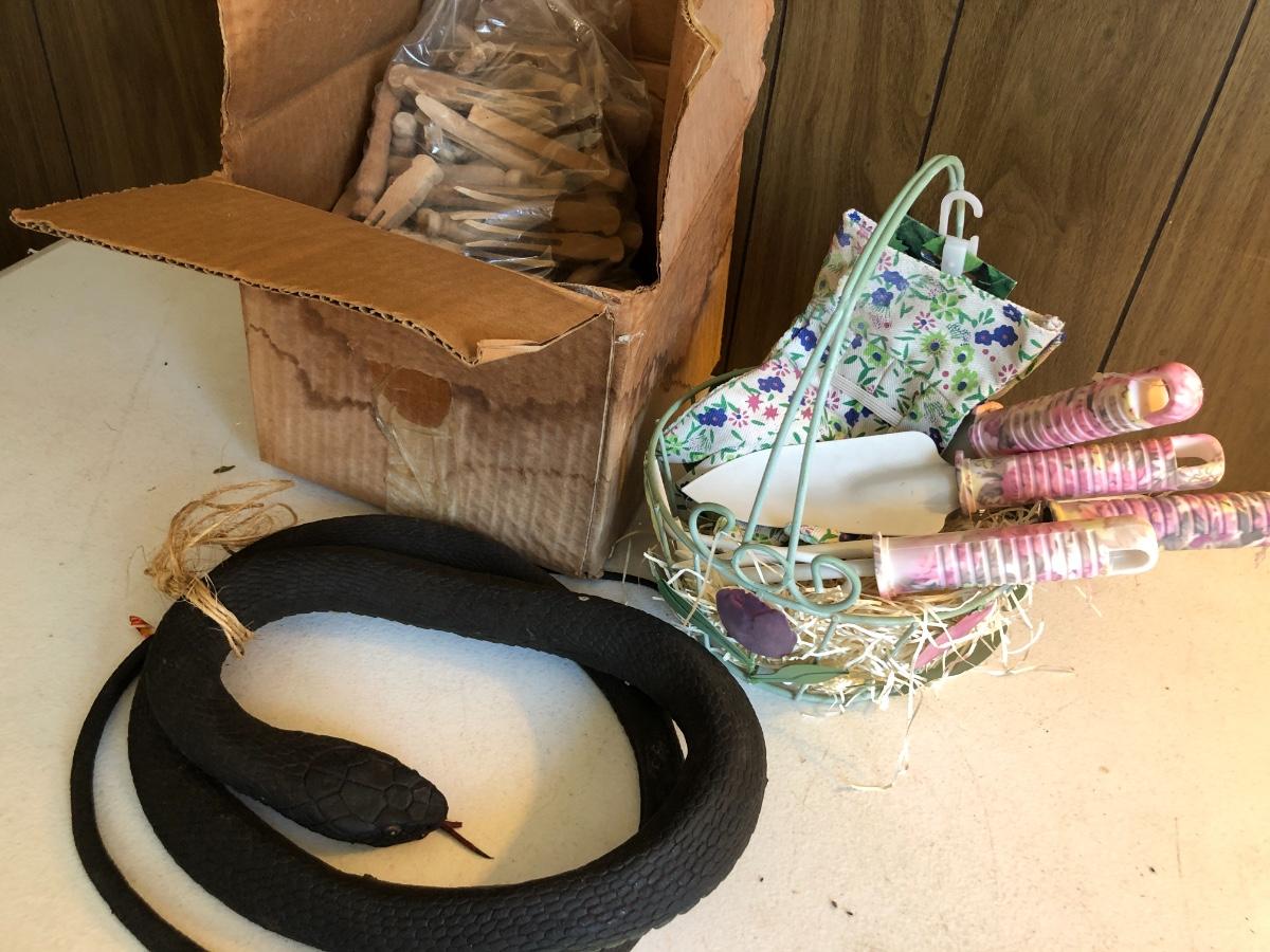 VTG Box of Wooden Clothes Pins, Garden Basket w/ Tools & Gloves, Lg. Rubber Snake