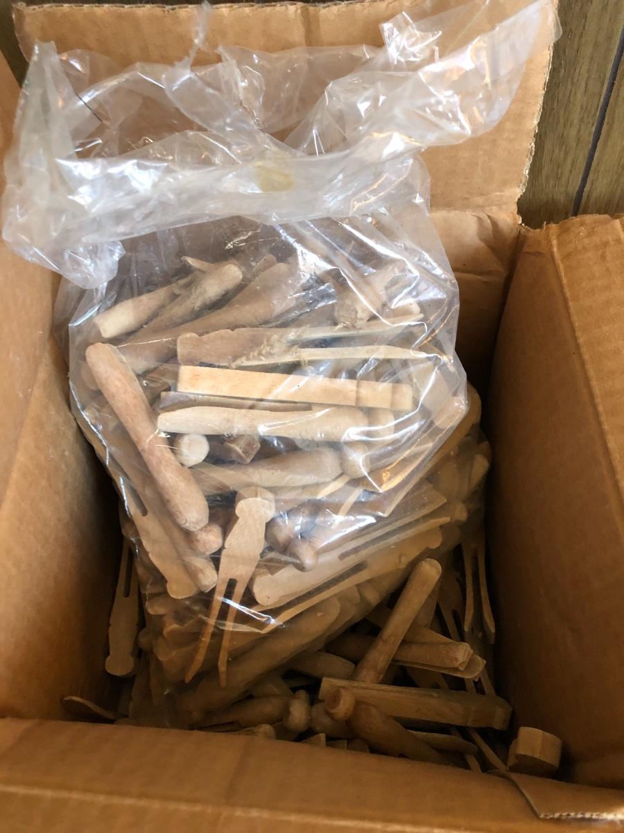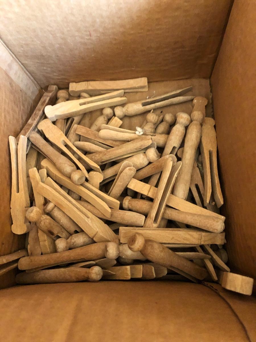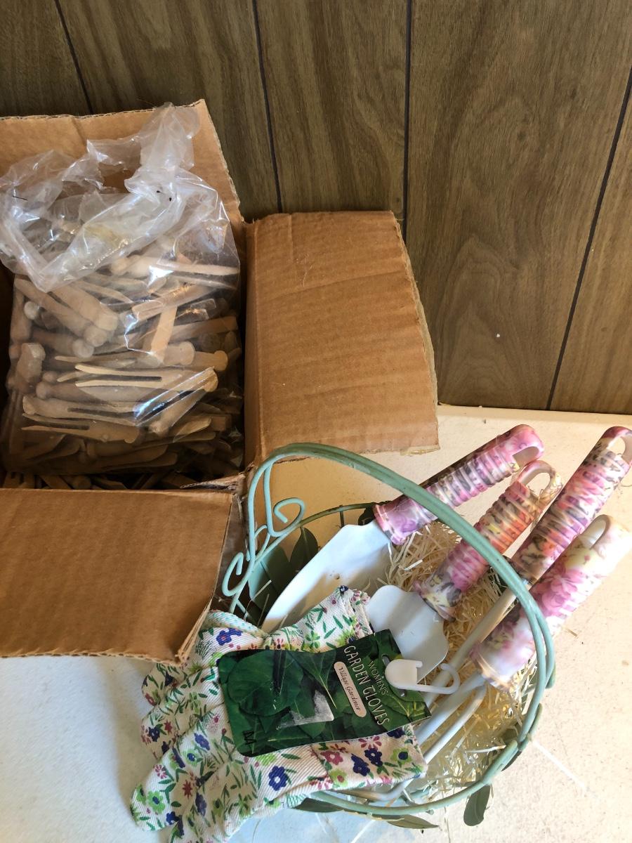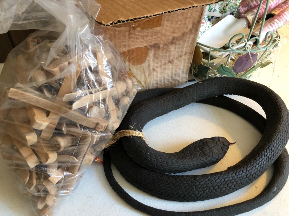 VTG Box of Wooden Clothes Pins, Garden Basket w/ Tools & Gloves, Lg. Rubber Snake