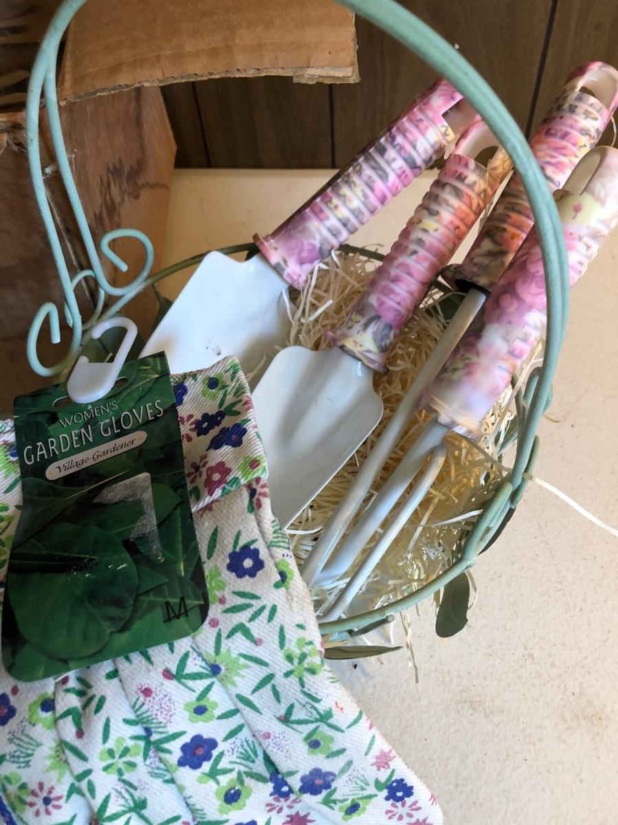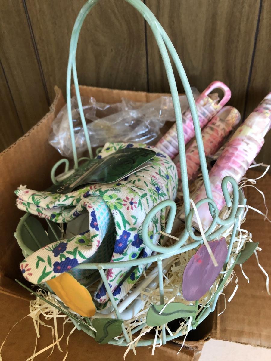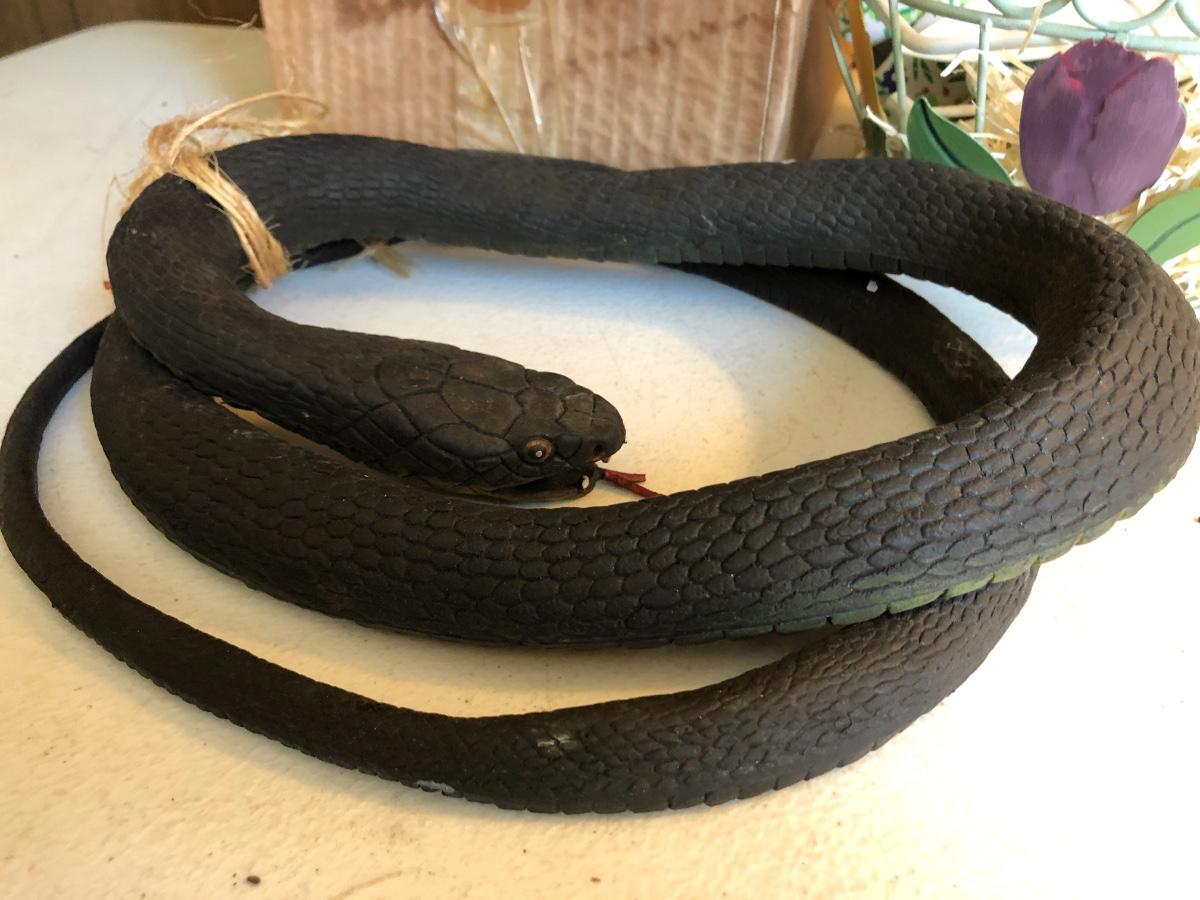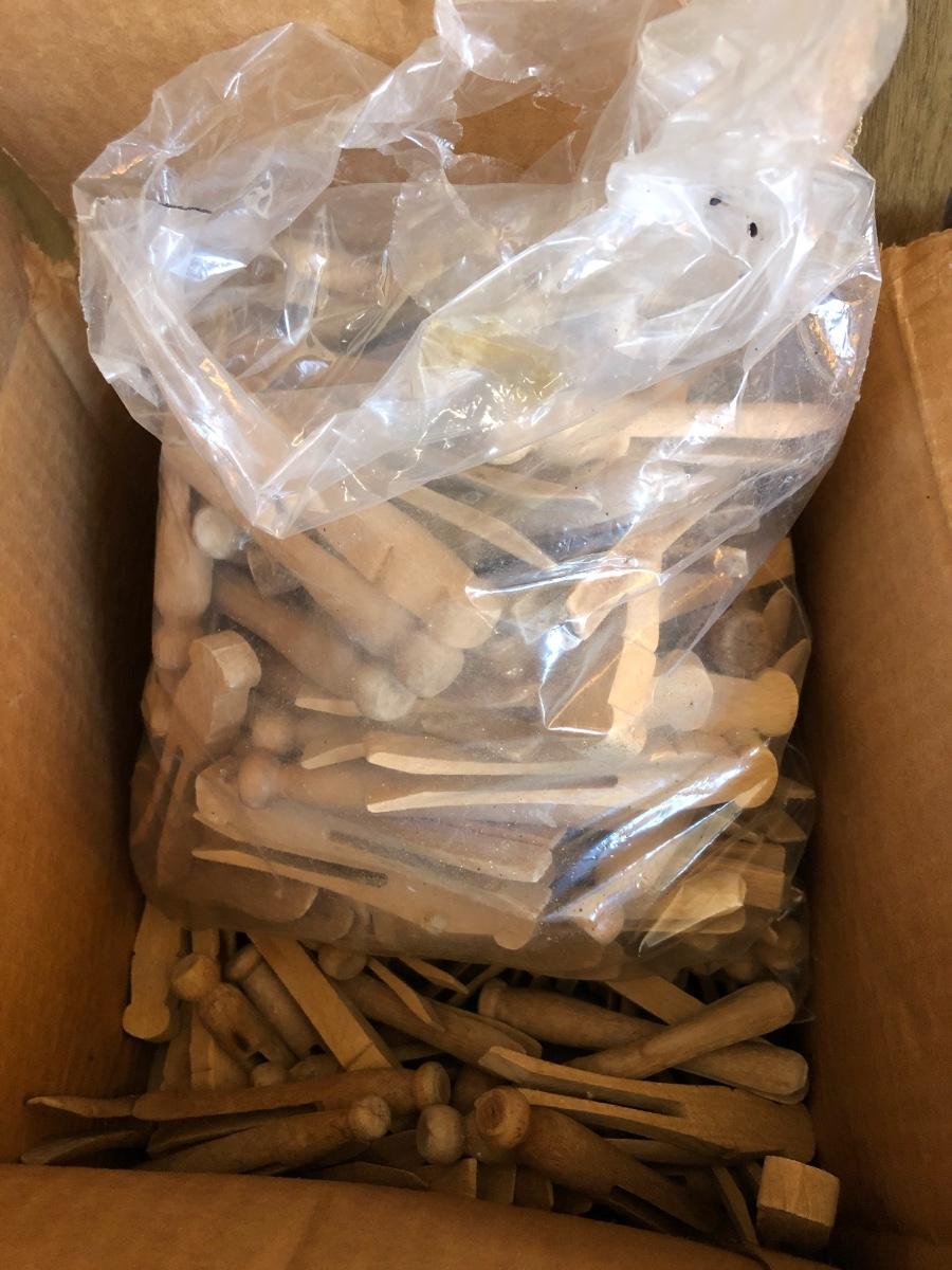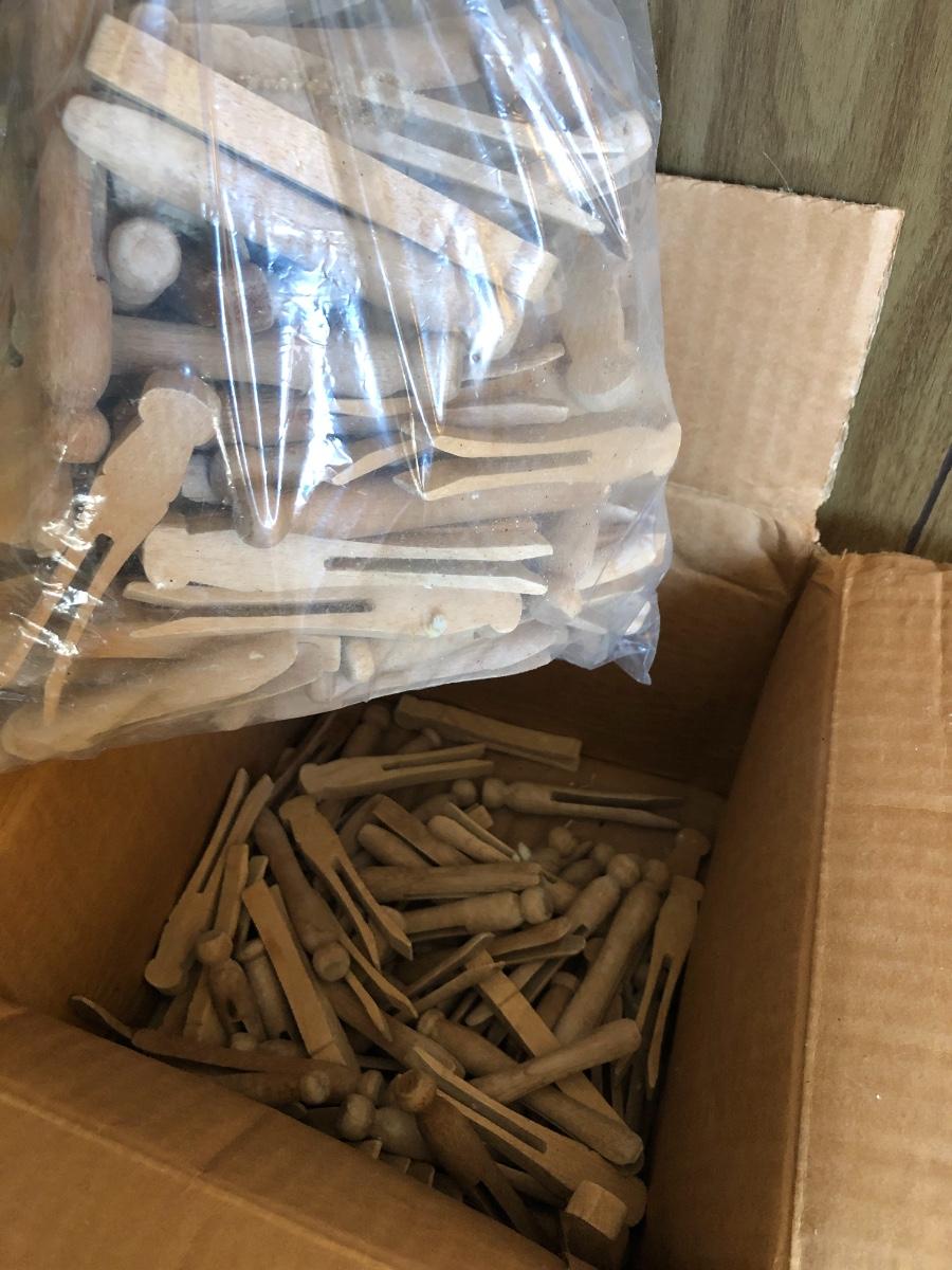 VTG Box of Wooden Clothes Pins, Garden Basket w/ Tools & Gloves, Lg. Rubber Snake
