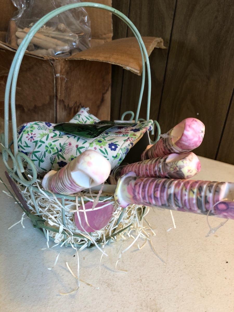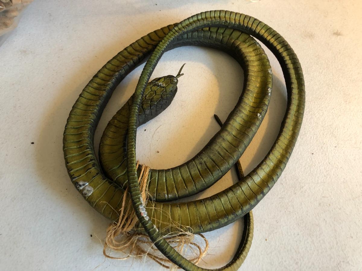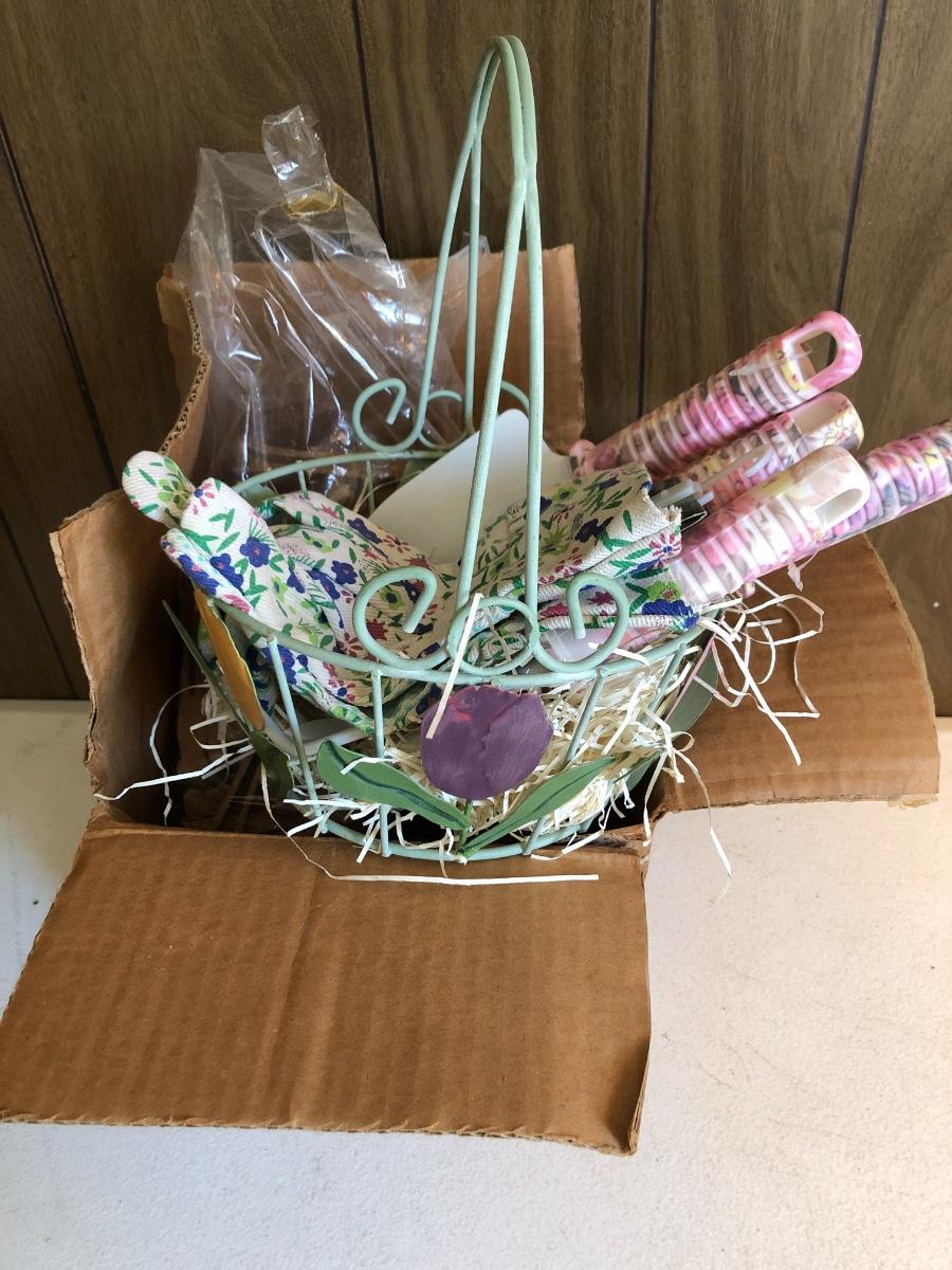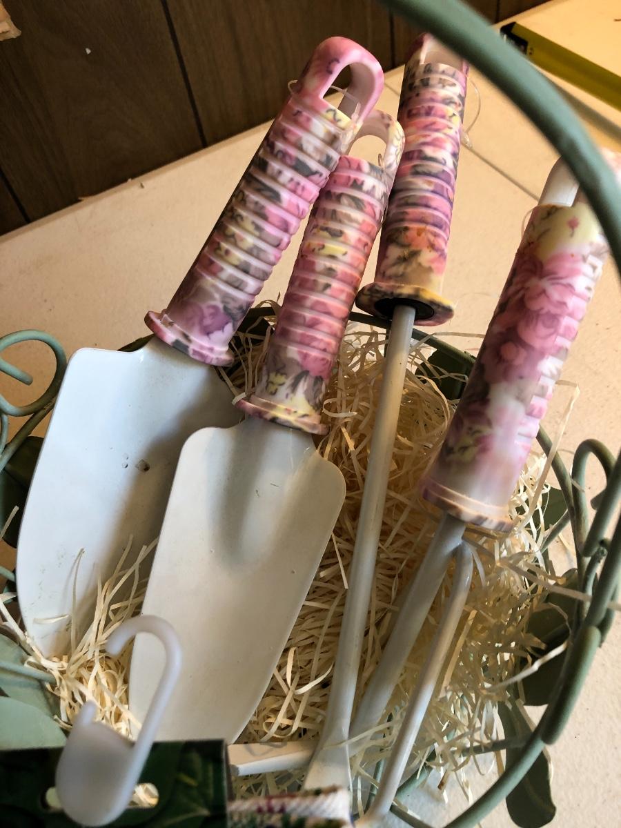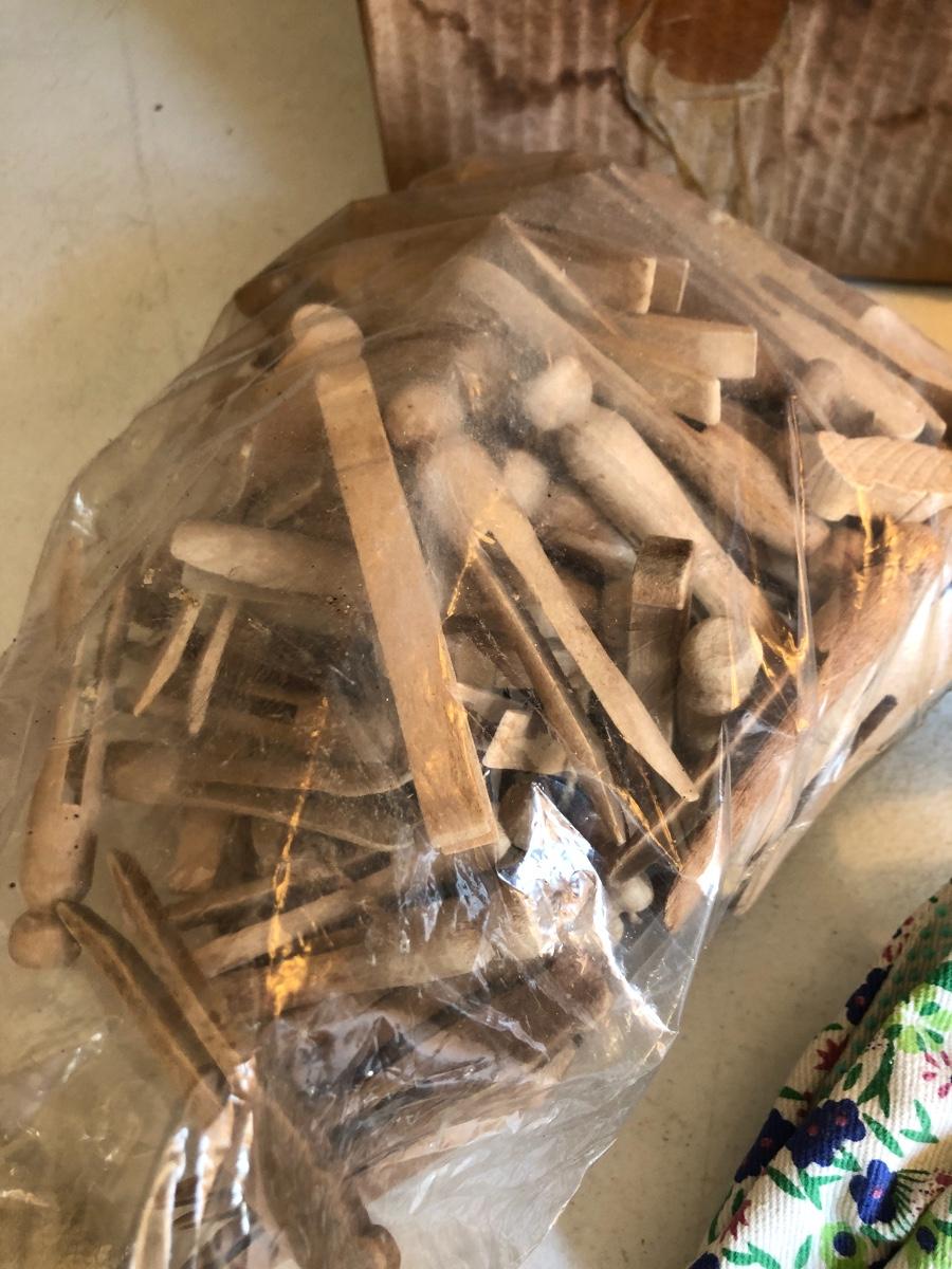 VTG Box of Wooden Clothes Pins, Garden Basket w/ Tools & Gloves, Lg. Rubber Snake